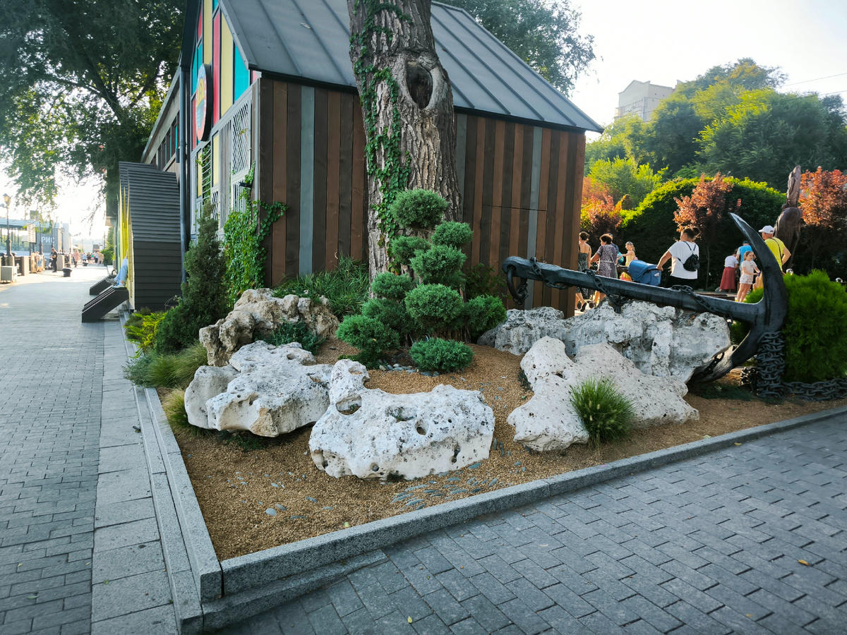 В первую очередь мне нравится сочетание камня и растений. И камни выбирали вдумчиво. Они особенные и местные. Отлично впишутся в эдакий степной сад. Хоть здесь и не совсем эту идею пытались обыграть. Но вот в степном саду я вижу именно такие камни.