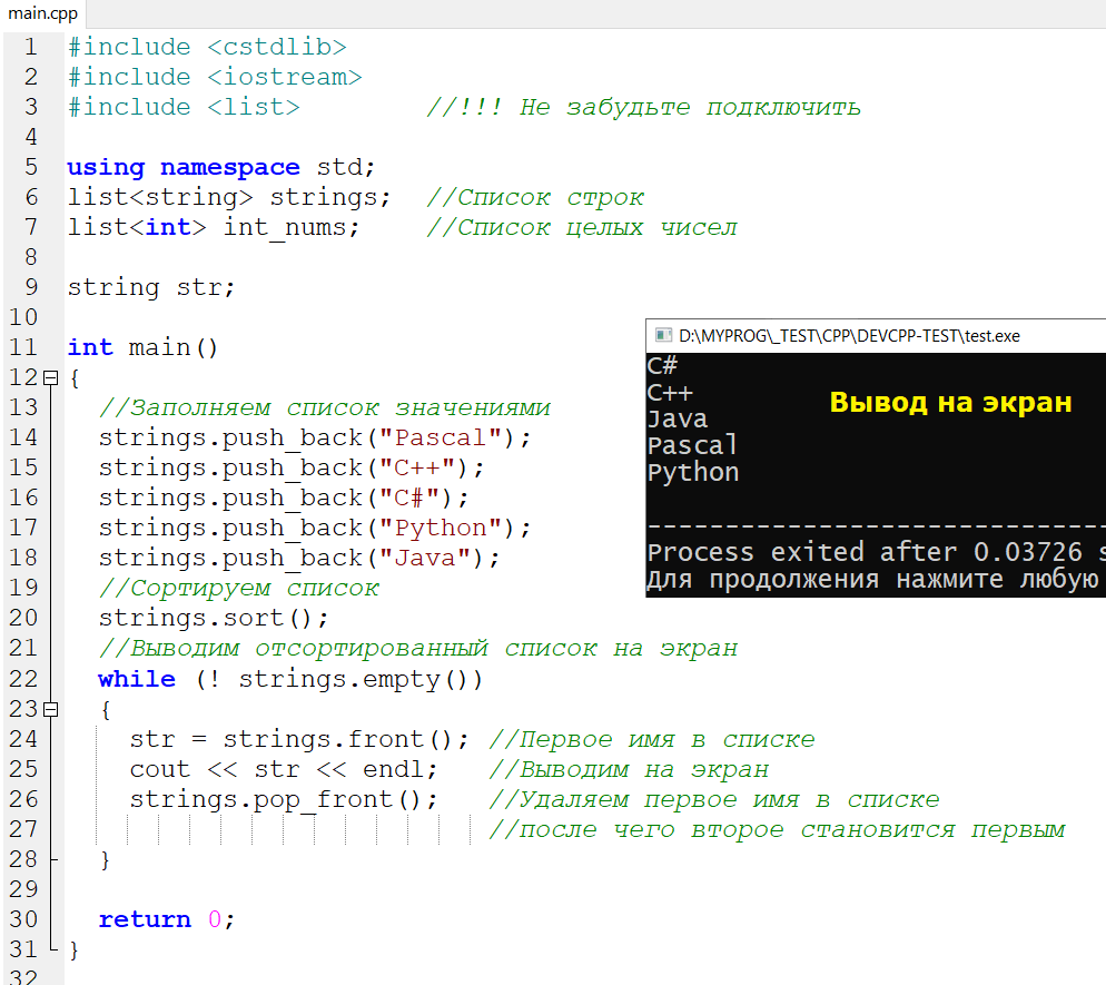 STL - стандартная библиотека шаблонов в С++ (Standard Template Library) содержит множество полезных вещей. В том числе контейнер list, который удобно использовать для вставки, сортировки, объединения списков и других операций над объектами. Например, если вам надо отсортировать какой-то список, то вы можете загрузить этот список в контейнер list и выполнить сортировку. Ну а дальше в зависимости от задачи - можно вывести на экран или выполнить какие-то другие действия. Правда, некоторые вещи делать нельзя. Например, нельзя обратиться к произвольному элементу списка (как в массиве по индексу). Точнее, можно (например, перебрать список в цикле и найти нужный элемент), но все эти способы не быстрые и не очень удобные. Впрочем, у каждой вещи своё предназначение. И своё предназначение этот контейнер выполняет. Пример: Здесь мы сначала объявляем переменную strings - список строк. В угловых скобках после слова list мы указываем тип элементов списка. Это могут быть, разумеется, не только строки