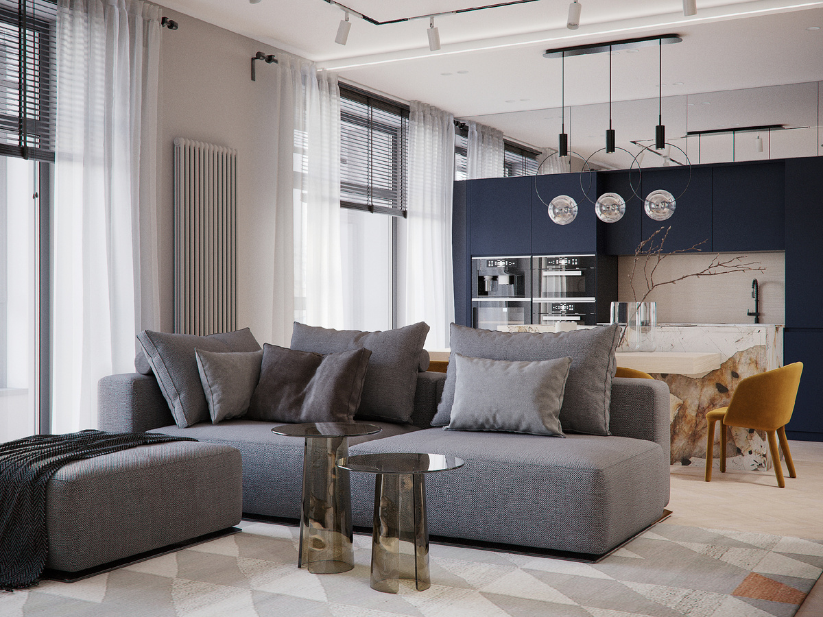 В проекте интерьера этой современной квартиры, расположенной в ЖК Эталон на Неве, каждую деталь мы продумали до мелочей, создав гармоничное и стильное пространство. Гостиная и кухня образуют единое целое, что позволяет добиться ощущения простора и света. Центральное место в гостиной занимает удобный и стильный диван в нейтральных серых тонах. Рядом с диваном мы разместили элегантные столики с металлическими основаниями, добавляющие комнате современный штрих. Зона с телевизором оформлена с применением минималистичных решений – большой телевизор размещен на стене с фактурной отделкой под бетон, что придает пространству современный и стильный вид. Кухня, в свою очередь, притягивает взгляд благодаря оригинальному острову со столешницей из натурального кварцита Патагония. Глубокий синий цвет кухонных фасадов гармонично сочетается с обивкой стульев, создавая утонченный и изысканный вид. Создав конструкцию острова нетривиальным способом, мы нашли место для функциональной зоны столовой. Холл
