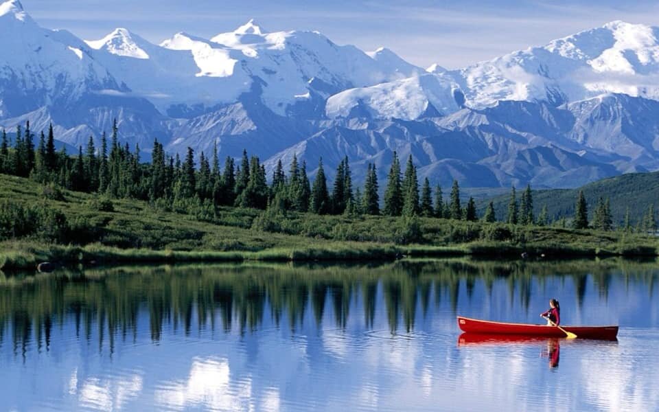 Обязательно нужно заехать в Национальный парк Денали - один из самых потрясающих заказников в мире. Машину придется оставить на парковке – по парку Денали и бэкпекеров, которые собираются ночевать в палатке, и путешественников, направляющихся в гостинице, развозят бывшие школьные автобусы, которые просто перекрасили в зеленый цвет. Комфорт днём сомнительный - сидения неудобные и жёсткие, да и едет он по грунтовке. Но зато водитель обязательно притормаживает, заметив невдалеке какую-нибудь живность и дает время полюбоваться на зверушку. А дорога идёт параллельно Аляскинскому хребту к сияющей вершине Денали. Она забирается всё выше и выше, то ныряет в долины, пылающие зарослями иван-чая, то поднимаюсь на голые тундровые склоны, то углубляясь в еловое редколесье.