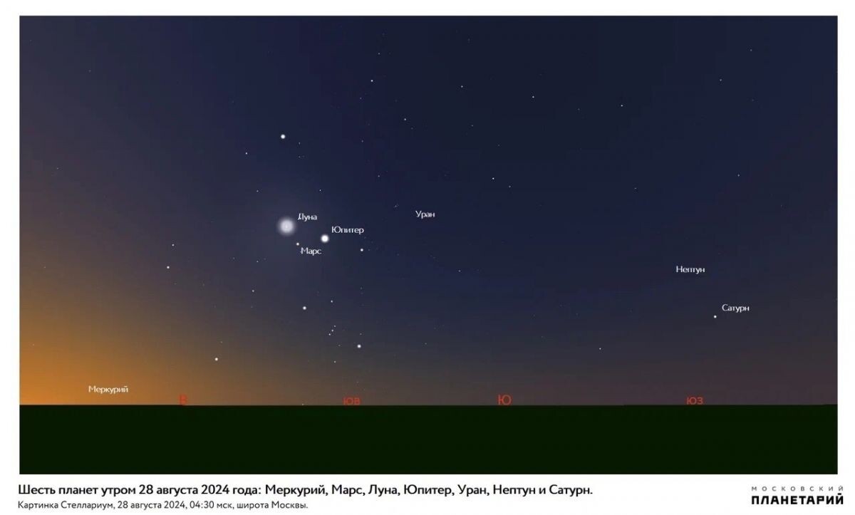 Жители Рязани и Рязанской области смогут увидеть парад из шести планет. Об этом сообщает Московский Планетарий. В августе на небе можно наблюдать редкое явление - парад планет. С полночи до рассвета сразу пять планет: Марс, Юпитер, Уран, Нептун и Сатурн будут видны на небе. В конце месяца, после 4:00 утра, к ним присоединится Меркурий, а 28 августа - убывающая Луна, которая будет находиться рядом с Марсом. Все планеты выстроятся в ряд восточнее ( справа ) от восходящего солнца в секторе около 160 градусов. Часть из них, при ясной погоде, можно будет увидеть невооруженным глазом, а остальные - в бинокль или телескоп.
