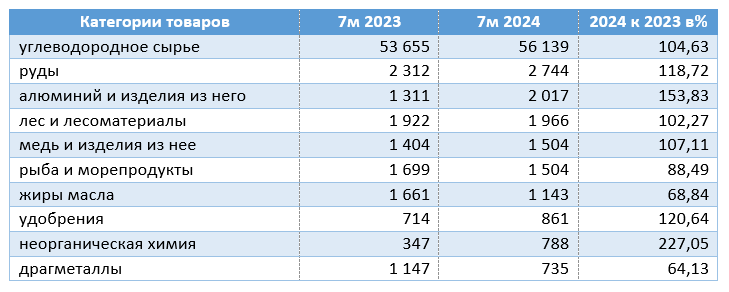 Для дальнейшего анализа выделим категории российских товаров, закупленных Китаем в январе-июле 2024 года на сумму, больше 10 млн USD, и ранжируем по динамике объемов поставки в денежном выражении.