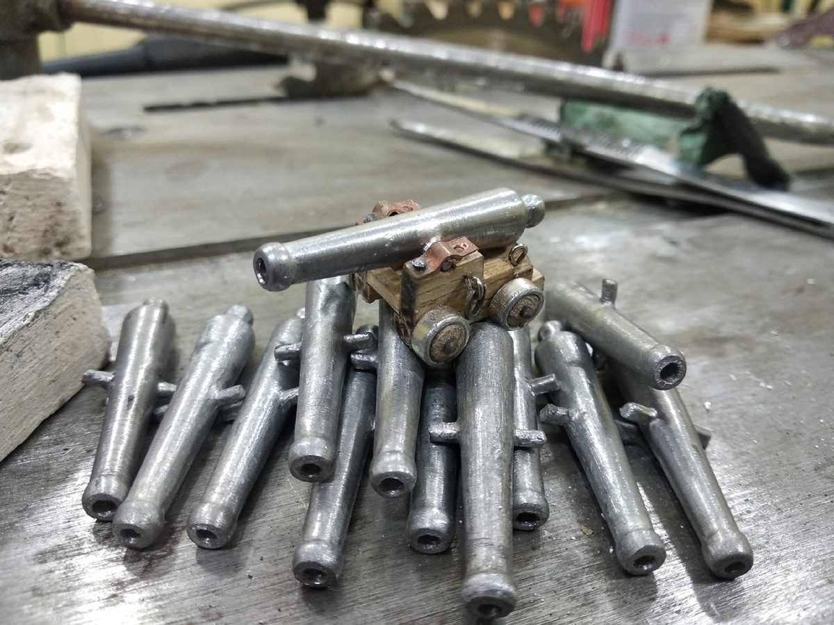 Как правило пушки отливают из чугуна или бронзы. Наиболее тяжелые пушки устанавливают на первой палубе от ватерлинии, остальные, более легкие находятся на юте и баке. На стволах пушек имеются приливы-цапфы, при помощи которых они лежат в гнездах лафетов. В задней части находится отверстие для запала. Две дужки на стволе около цапф, служат для крепления талей при установке ствола на лафет. Лафеты изготавливают из дерева и скрепляют железными болтами. На осях находятся деревянные колеса, окованные железными ободьями. На поперечной балке между стенками лафета устанавливают деревянный подъемный клин, на который опирается ствол. Полотняный шнур-фитиль, зажимают в вилке пальника, а его свободный конец обматывают вокруг штока. Рымы продевают в обухи, проходящие через борт и заклинивают с внешней стороны борта. А теперь я хочу рассказать как я отливал пушки. Для начала нам понадобится: гипс, строительная известь, вода, баночка ( очень хорошо подходит баночка для анализов), кисточка, малярный