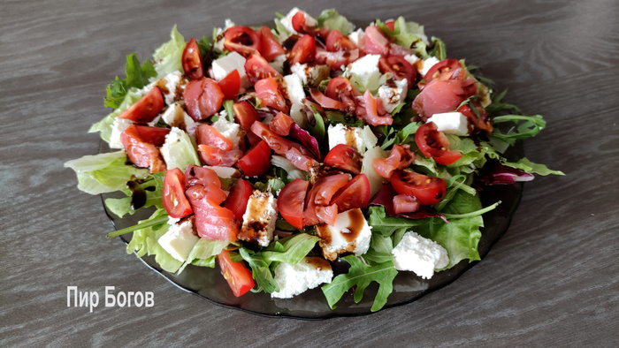 Сегодня приготовим очень простой и вкусный салат из красной рыбы и сыра. Я очень люблю такие салаты, которые легко готовятся и не перегружены ингредиентами, заправками. А еще прекрасно подходят для обычного ужина и праздничного стола. Его можно приготовить, когда гости уже пришли, так как для него ничего варить не надо. Только заранее помыть салат и выложить сушиться. Состав: 100Гр (6шт) черри. Салатная смесь. 120Гр брынзы или фета. 90Гр соленой красной рыбы. Оливковое масло. 1/3 Сока лимона. 1Ст.л. бальзамического уксуса. Бальзамический соус. Черный перец. Способ приготовления: Все ингредиенты лучше сразу выкладывать на блюдо для подачи или на большую плоскую тарелку. Выкладываем красивыми слоями. Листья салата рвем руками, а более плотные части нарезаем ножом. Можно взять и готовую салатную смесь. Рассольный сыр (брынза, фета) нарезаем кубиком. Черри нарезаем дольками. Филе красной рыбы нарезаем полосками. Сверху поливаем бальзамическим соусом и слегка сбрызгиваем оливковым маслом. П