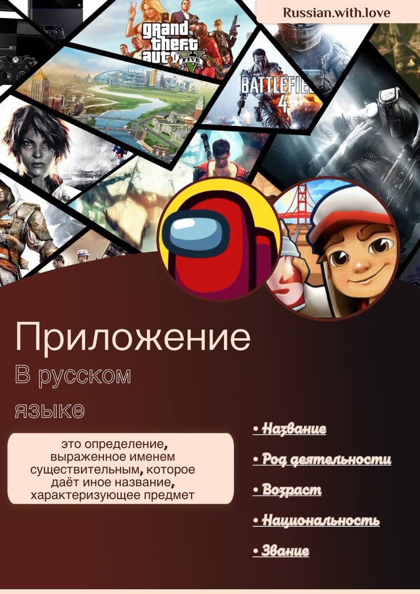 Поговорим о ПРИЛОЖЕНИЕ 👾🎮 #теория И нет, речь пойдет не о цифровых программах, предназначенных для выполнения определенных задач ❌ 🙋♀️ Приложение — это второстепенный член предложения, который даёт другое название предмету и обозначает свойства, качества, родовые признаки определяемого слова, что делает его похожим на определение. Да,да, названия Ваших любимых мессенджеров, фильмов и сериалов, книг, игр - не что иное, как приложение) ✅ На новый телефон я установила игру Among US (название) ✅ Врач - педиатр рассказала ребятам, как правильно закаляться (род деятельности) ✅ Учитель-француз провёл интересное занятие (национальность) ✅ Полковник А.Е. Коберман участвовал в параде (звание) ✅ Из далека долго течет река Волга (географическое название) Ставь реакцию, если дочитал до конца!