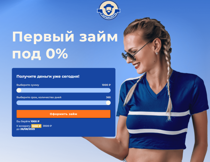 На сайте "У Абрамовича" предусмотрена акция: первый займ можно оформить под 0% при условии своевременного погашения без просрочек. Оставьте заявку по ссылке.