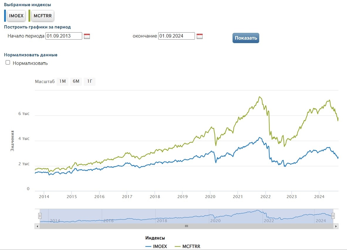 Можно понять почему. На картинке выше вы видите два индекса - IMOEX - на российские акции без учета дивидендных выплат, и MCFTRR - с учетом дивидендных выплат.