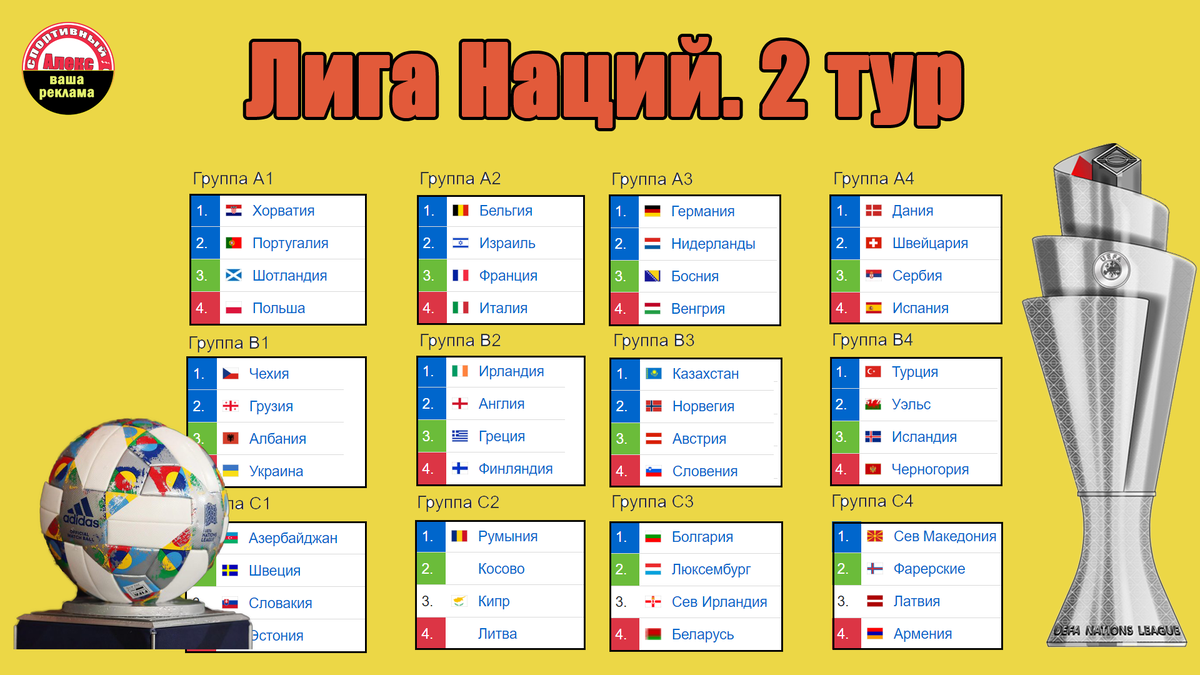 Здравствуйте. Вы на канале «Алекс Спортивный». В Лиге Наций УЕФА продолжается 2-й тур. Здравствуйте. Вы на канале «Алекс Спортивный». В Лиге Наций УЕФА продолжается 2-й тур. Как сыграла группа А2? Франция победила Бельгию - 2:0. Усман Дембеле в первом тайме помог отметится Коло Муани, во втором тайме нападающий отметился самостоятельно. Килиан Мбаппе начал матч со скамейки запасных. Это 12-я победа Франции в истории, у Бельгии - 5. Италия в Будапеште разобралась с Израилем - 1:2. Таблица. Италия - 6 очков. Голы: 5/2. Франция, Бельгия - 3 очка. Голы: 3/3. Израиль проиграл оба тура, 0 очков. Голы: 2/5. Расписание 3 тура. Третий тур ожидается 10 октября. Как сыграла группа В3? Норвегия - Австрия - 2:1. Словения - Казахстан - 3:0. Победу норвежцам на 80-й минуте принёс Холанд, в другой игре группы словенец Беньямин Шешко оформил хет-трик. Футболист второй сезон выступает за «Лейпциг». Таблица. Словения - 4 очка. Голы: 4/1. Норвегия - 4 очка. Голы: 2/1. Австрия - 1 очко. Голы: 2/3. Казахст