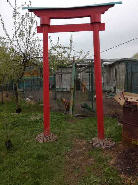 Ох уж эти приятные воспоминания о нашей поездке в Японию! Два года после этого я вынашивала желание сделать Тории на нашем садовом участке в Онуфриево, и главное-вписать эти японские ворота в ландшафт. Дополнительная сложность вопроса была в том, как сделать технически конструкцию своими силами (!) и с небольшими затратами, причем максимально приближенную к оригиналам. И, наконец, под осень 2022 года основные элементы конструкции были выпилены, ошкурены и покрашены в красно-коралловый цвет силами нашего семейного дуэта. Установить непосредственно осенью Тории не получилось, но как только в следующем году после зимы появилась возможность , и земля подсохла после весеннего снеготаяния- Тории были вкопаны и собраны в финишную конструкцию. Тории по задумке обычно стоят на пути к святилищу (сандо) и отмечают начало священной территории. Ну, у меня с выбором территории не густо. И потому МАФ "Тории" поставили при входе в зону большого курятника. Да, королевства маловато))) Но с балкона в