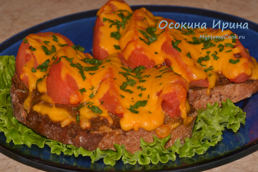 Это блюдо может выступать в качестве завтрака, закуски, а то и самостоятельного блюда - сытное и питательное. Ломти мультизлакового хлеба густо смазала печёночным паштетом, поверх разложила сегменты очищенных от кожицы мясистых домашних помидоров, посыпала тёртым сыром и запекла в духовке, разогретой до 180 градусов, в течение 10 минут, достала, посыпала рубленной петрушкой, немного охладила и подала. Вкуснятина) Приятного аппетита