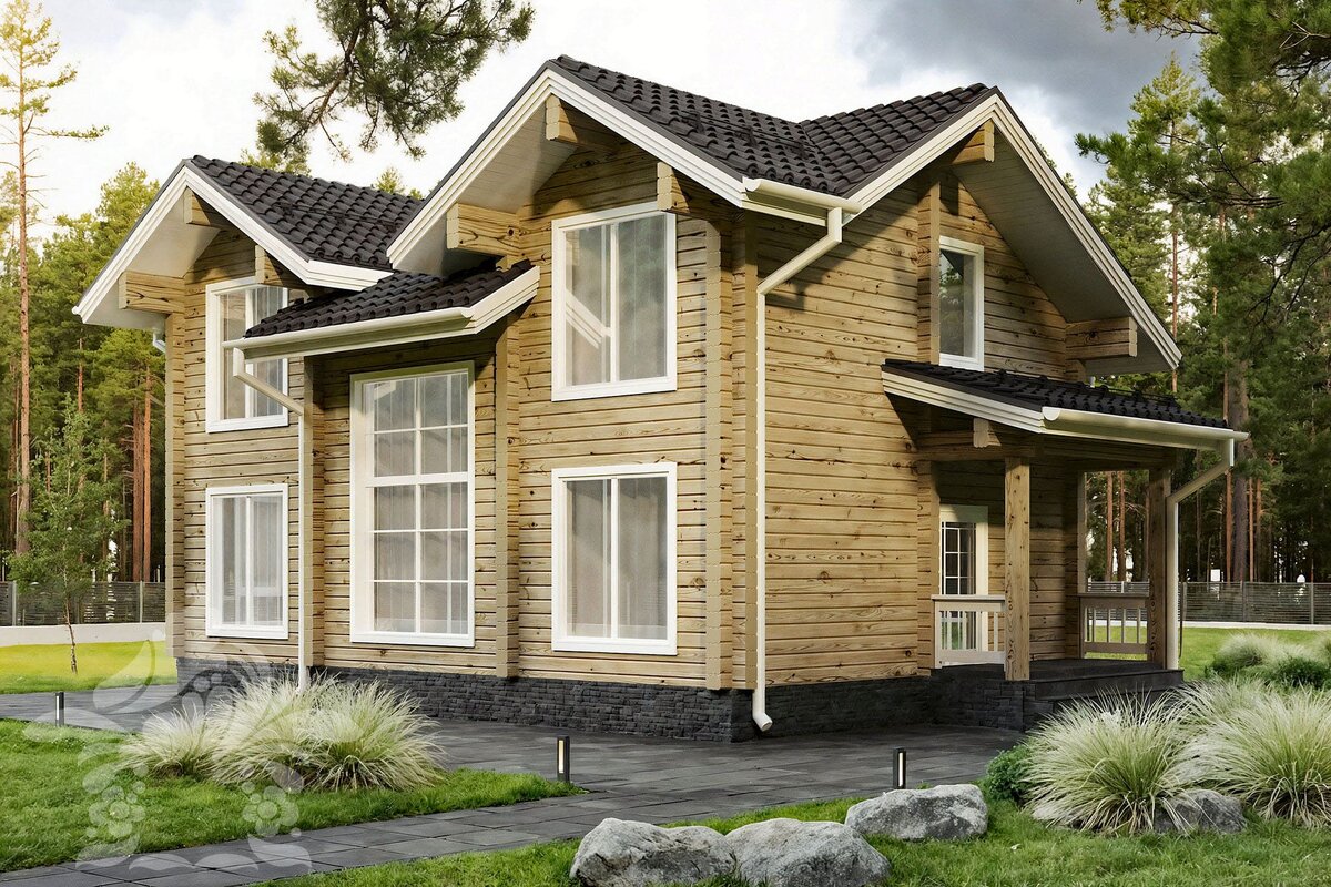 Небольшой по современным меркам загородный дом с мансардным этажом, выгодный в строительстве. Что позволяет с меньшей доплатой сменить стеновой материал на более качественный. Вместо обычного бруса или профилированного выбрать клееный, к примеру. Чтобы эксплуатация строения не огорчала вас впоследствии. Цвета стен на визуализации проекта выбраны произвольно. Могут быть другими в вашем случае. Крыша по проекту цементно-песчаная черепица BRAAS. Возможна замена на металлочерепицу, мягкую кровлю. Мы используем в строительстве клееные стропила, имеющие отличную несущую способность. Пригодные для монтажа тяжелой натуральной черепицы. Такие стропила стоят дороже, зато имеют строгую геометрию, в отличие от типовых обрезных пиломатериалов не подвержены деформации и биологическому поражению. Монтируются цельными на длинных скатах, нет нужды наращивать по длине как стандартную доску 6-ти метровой длины. Двухэтажный дом из бруса с крышей усложненной формы для одновременного проживания 4-6 человек.