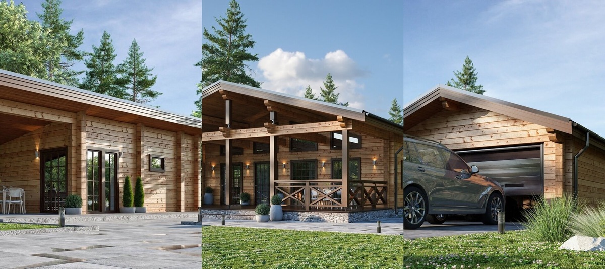 Мы предлагаем комплексную застройку участков "под ключ" То есть: планируем территорию, предусматриваем инженерные коммуникации, ставим все необходимые строения, делаем ландшафтный дизайн и внешнее ограждение. Преимущество комплексной застройки заключается в одинаковом дизайне, строительных и отделочных материалах, защитных составах. Чтобы всё в целом выглядело гармонично. Если у вас в планах несколько строений из схожих материалов в одном месте, лучше их строить одновременно. Что бы все строительные материалы были из одной партии. К примеру, идентичные по наименованию кровельные материалы из разных партий могут отличаться по оттенку. Не говоря уже об отложенной колеровке в выбранный цвет масла для дерева - та еще лотерея. Большой дом из клееного бруса в комфортном одноэтажном исполнении. С застекленной верандой под зимний сад, совмещающий функцию тёплого тамбура, интегрированный в здание под одной с ним крышей. И открытой террасой 57 кв.м. расположенной вдоль всего главного фасада стро