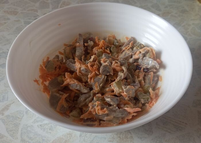 Охладить и нарезать на удобные для жевания кусочки Нарезать немного лука. Немного - это примерно четвертинку, чтобы луковый вкус не перебил все остальные Среднего размера морковку натереть помельче Один, два огурчика нарезать помельче Заправить майонезом с ложечкой горчицы Готов салатик.