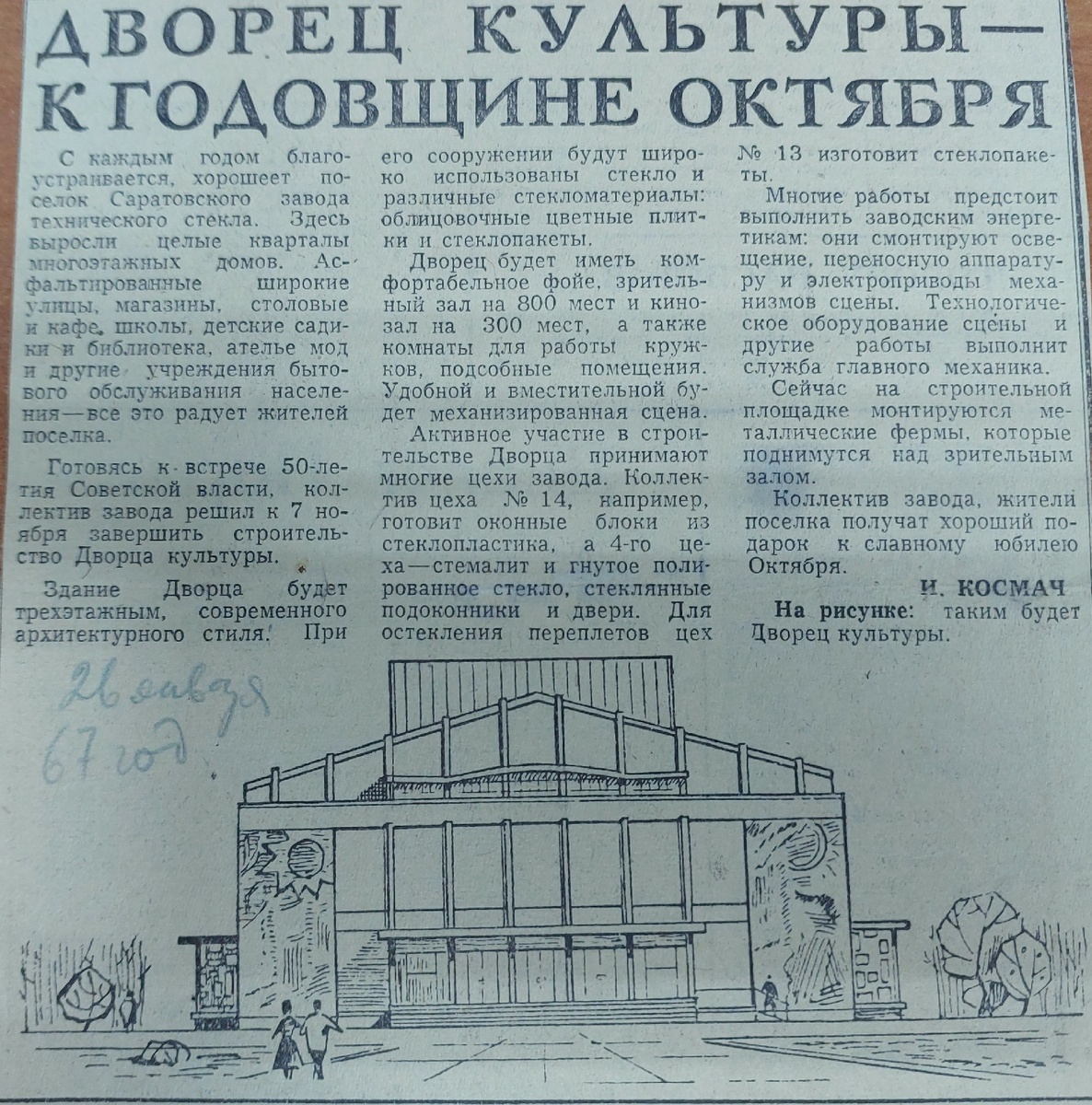 Заметка из неизвестной газеты от 26 января 1967 года. "Дворец культуры - к годовщине Октября". В заметке повествуется о благоустройстве поселка Саратовского завода технического стекла. #Саратов #город #Моя_саратовская_жизнь #история #краеведение #интересно #воспоминания #газеты_МСЖ