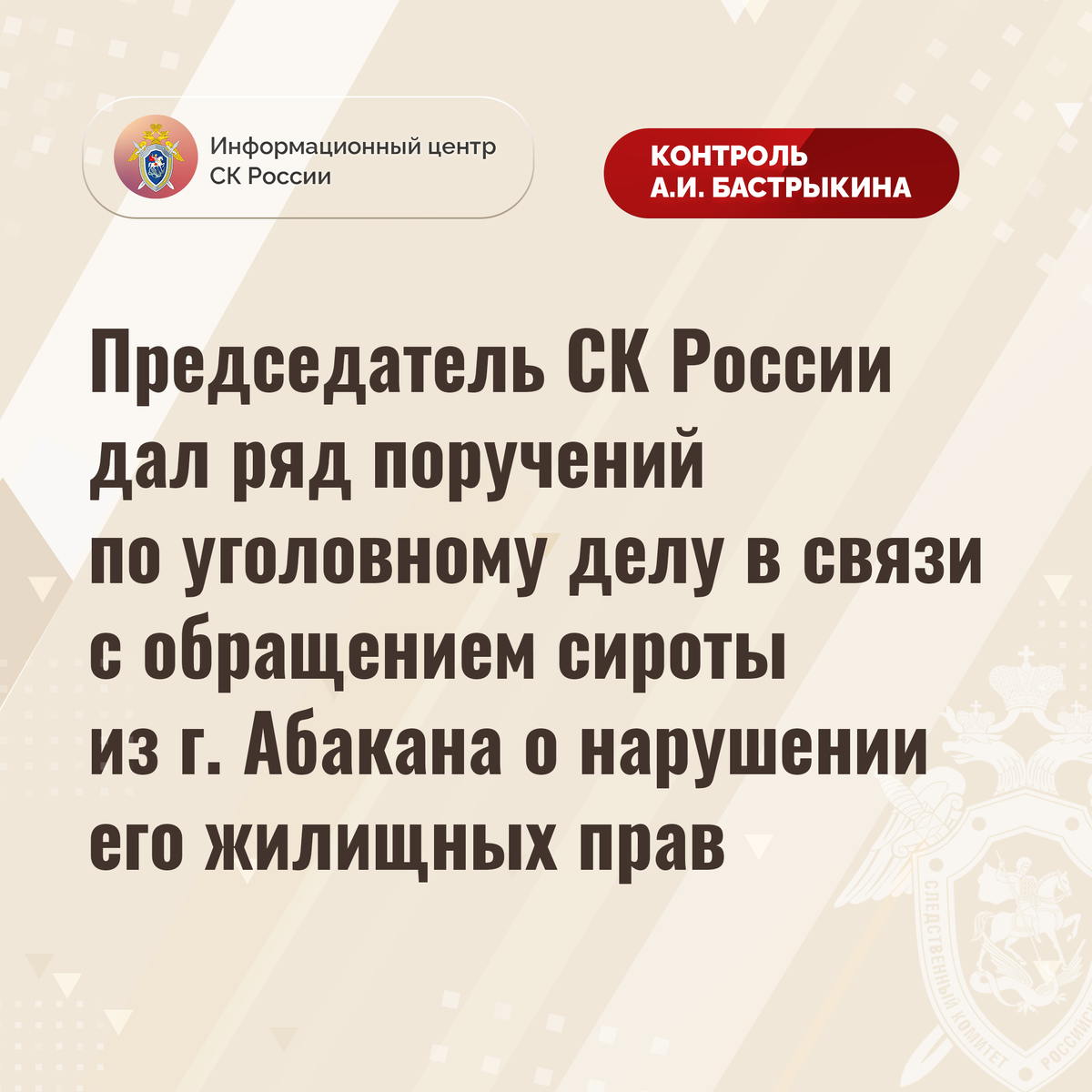 Председатель СК России дал ряд поручений по уголовному делу в связи с обращением сироты из г. Абакана о нарушении его жилищных прав