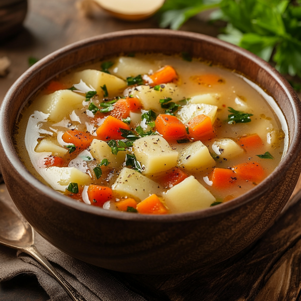 Сегодня расскажу вам, как приготовить одно из моих любимых блюд – жидкую картошку. Это нежное, сытное и невероятно простое блюдо. Картофель сам по себе очень питателен: богат витаминами С и В6, калием и клетчаткой, что делает его отличным выбором для здорового питания. А в этом блюде картофель особенно хорошо сохраняет свои полезные свойства, ведь готовится без излишков жира и масла. Картофель — 5-6 шт. (средние) Морковь — 1 шт. Сладкий болгарский перец — 1 шт. Томатная паста — 1-2 ст. л. Лавровый лист — 1-2 шт. Специи: паприка, куркума, чёрный перец — по вкусу Соль — по вкусу Вода — 1-1,5 л Зелень для украшения: укроп, петрушка Жидкая картошка прекрасно сочетается с любым свежим хлебом, особенно цельнозерновым. Она также идеально подойдёт к салату из свежих овощей или зелёных листьев. Для любителей более сытных блюд можно добавить ложку сливочного масла или сметанного соуса. А если хотите больше вкусового разнообразия, подавайте её с обжаренными на сковороде шампиньонами или запечённы