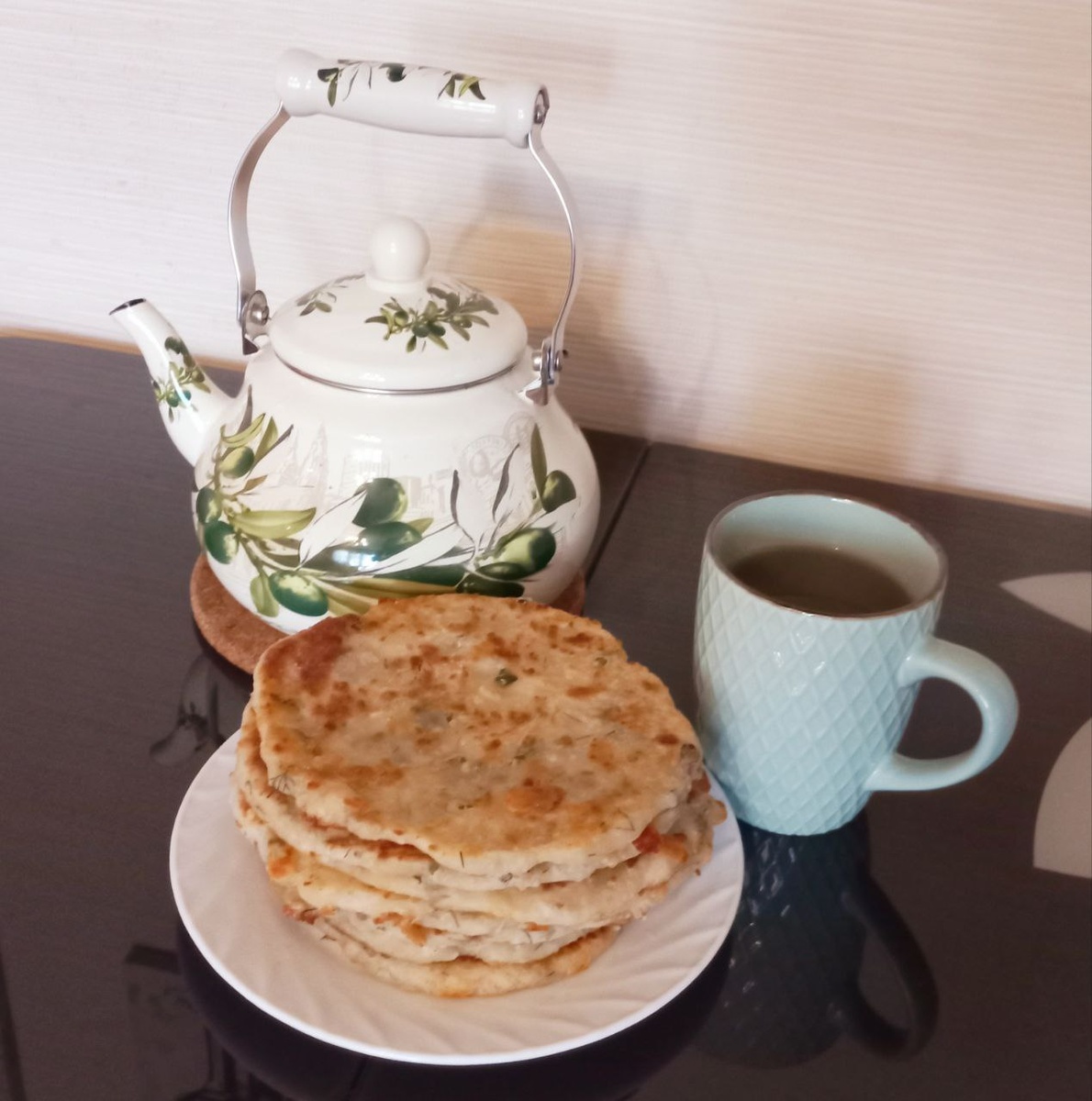 Быстрые сырно-творожные лепёшки на кефире с зеленью.