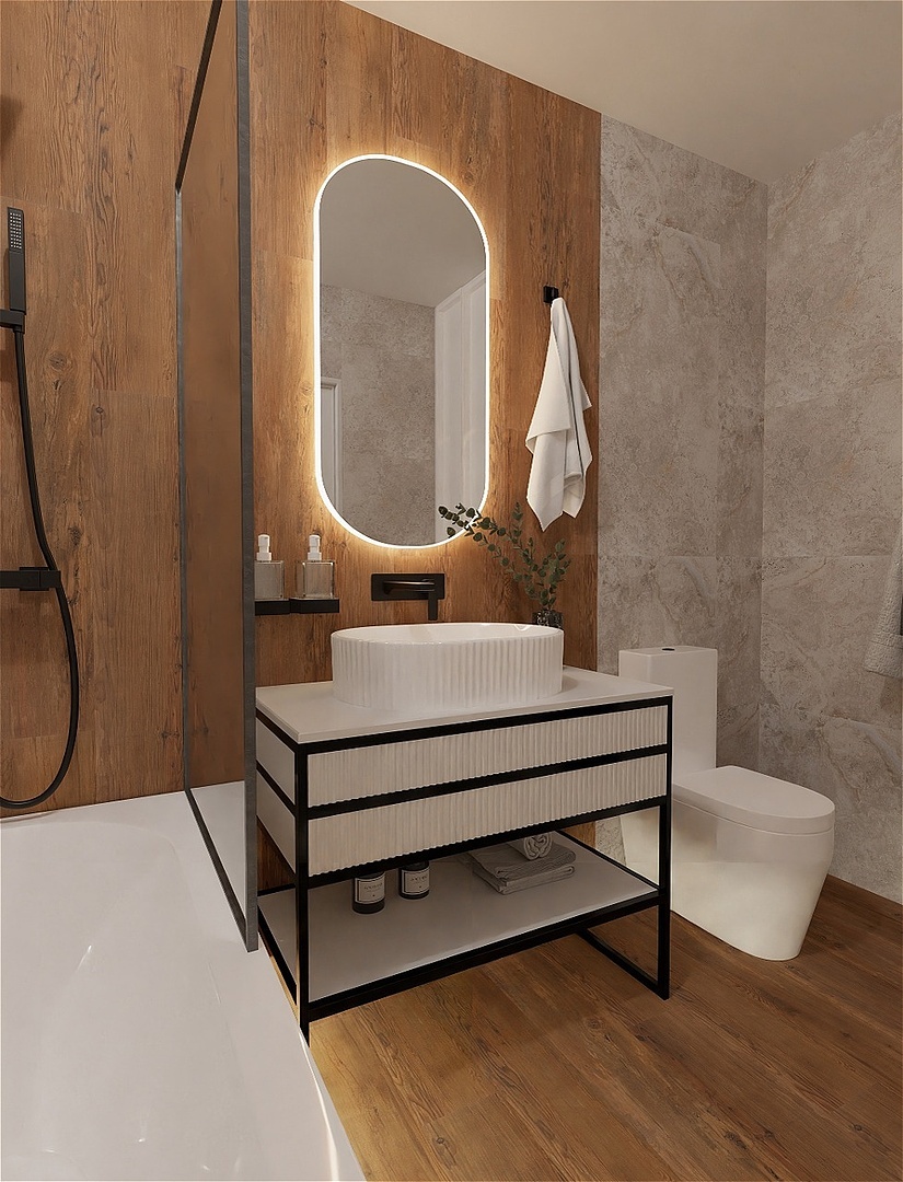 В качестве отделочного материала ванной комнаты выбран керамогранит Granite ONIX в серых и бежевых оттенках. Эти плитки с глубоким рисунком создают в интерьере атмосферу уюта и элегантности. Серые элементы добавляют современности, а бежевые — ощущение тепла и комфорта. Мебель, выбрана в сером цвете, гармонично дополняет плитку, создавая единый стиль. Светильники подчеркивают текстуру керамогранита.