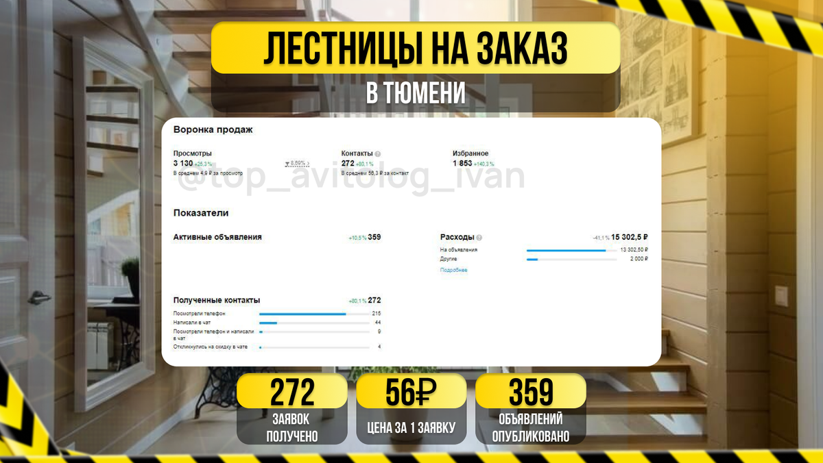 💥 272 заявки в месяц с Авито на лестницы на заказ. Цена за лид: 56 рублей. Эффективное продвижение на Avito.