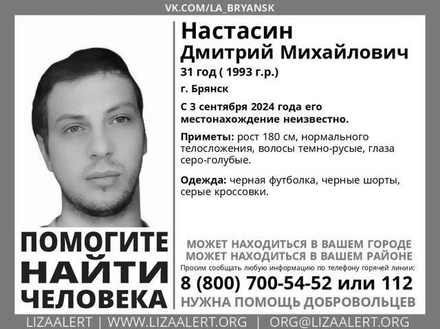 Поиски 31-летнего Дмитрия из Брянска были объявлены поздно вечером 6 сентября. Вчера днем поисковый отряд "ЛизаАлерт" Брянской области опубликовал сообщение: "Найден, погиб. Искренние соболезнования родным и близким". https://bryansknovosti.ru/?p=397617