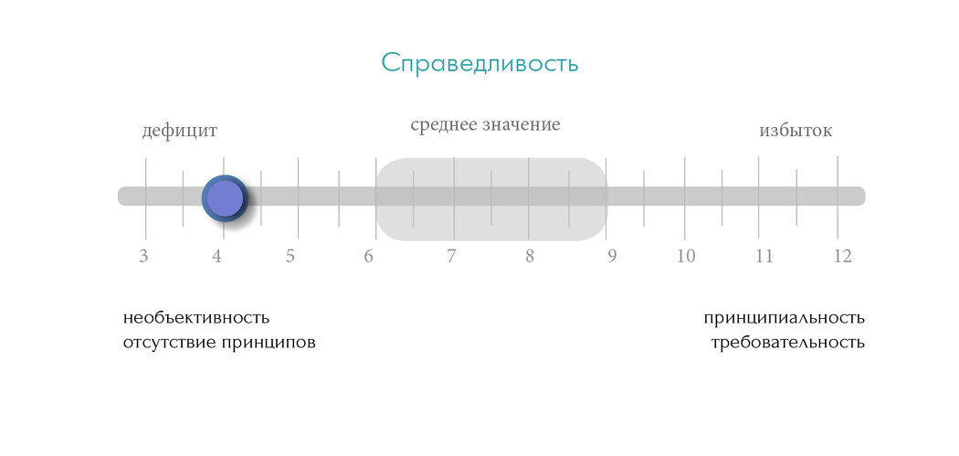 Это отрывок из будущей книги про социальные нормы, которые разрушительно влияют на "послушных и правильных" людей. На изображении, я отметила ползунок в районе дефицита этой способности, когда она слабо развита либо вообще не развита. Если Справедливость не развита и находится в дефиците(когда ее слишком мало), то человек будет постоянно подвергаться «захвату» со стороны других людей. Когда у нас нет своей системы координат и нашего личного понимания, что именно для нас хорошо, а что плохо, то тогда любое чужое влияние будет оказывать на нас давление, загоняя в чужие рамки. Здесь мы будем метаться между своим слабым пониманием того, как хотелось бы жить и чужими наставлениями как правильно и необходимо жить, воспитывать детей, где необходимо учиться и как выглядеть на работе. То есть Справедливость, как и все остальные способности, всегда будет отражаться в различных сферах и в наших отношениях с разными людьми (на работе, в семье, с друзьями, незнакомцами и т.д.). При этом в избыточно