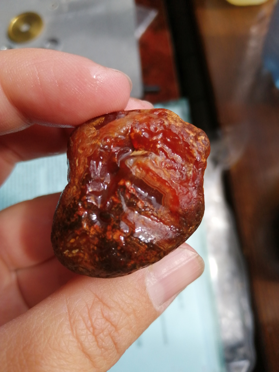 Вчерашний вечер посвятила полировке. Готовила школьный доклад с дочкой на тему "Это было этим летом". Какая мама, такие и доклады у ребенка 😁 Сделала с ней вдвоем комплект кабошонов из найденного ей камня. Я резала и придавала форму, а дочка помогала полировать. Но об этом напишу завтра, материал еще не готов. Заодно решила отполировать вторую половинку карнеола, которая лежала уже очень давно в ожидании, когда я до неё доберусь. Самые красивые и редкие для наших мест камни я хочу передавать местному музею, чтобы все смогли их увидеть. Половинку оставлять себе в коллекцию, половинку отдавать в музей. И этот агат как раз из таких. Вот он, я показывала его уже много раз: Одна половинка у меня уже давно отполирована, вы ее видели. А вторую я так и не доделала. Именно тогда, когда я занималась ее обработкой, у меня перестала нормально работать планшайба, и я отложила все до лучших времен. Камень пролежал год. И ладно бы просто пролежал! Перед шлифовкой я на ночь замочила его в жидком сте