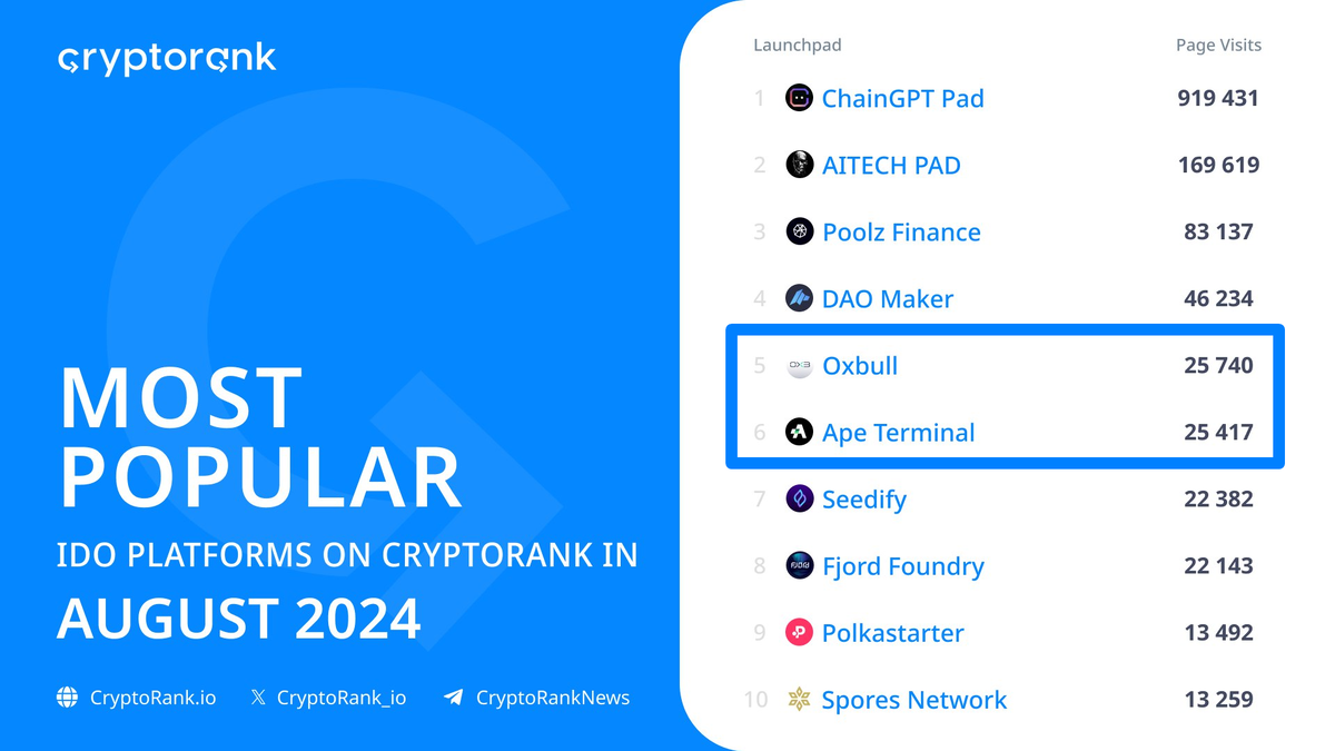 Данный контент не является финансовой рекомендацией. Проводите собственный анализ и принимайте самостоятельные решения. Топ-10 токенов самых популярных площадок для запуска IDO по версии CryptoRank в августе 2024 года(6/09/24): 1. ChainGPT (CGPT) 2. Solidus (AITECH) 3. Poolz Finance (POOLX) 4. DAO Maker (DAO) Данные анализа DAWR (переоцененность) Токен отсутствует При покупке высокорисковых активов соблюдайте риск-менеджмент и не забываете проводить DYOR. DYOR - это проведение самостоятельного детального анализа актива с целью оценить перспективность его покупки. Boosty-канал: DAWResearch Telegram- канал: DAWResearch #dawr #cryptorank #oxb