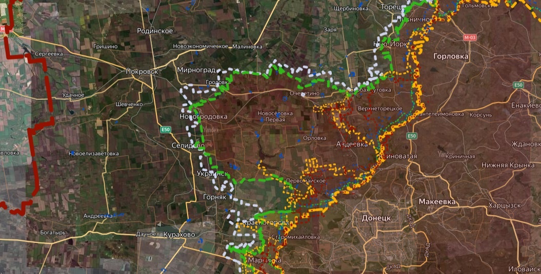 В последние дни наши силы вот тут (карта ниже) явно затормозили темп. Многим интересно почему? В чём причина такого развития ситуации? Наверное, надо пояснить уважаемым подписчикам о причинах, а то тут ещё и недруги пальцы гнут, что это из-за их действий. Ну, чего ж пошли разбираться, что тут и к чему: Легко увидеть, что у наших получился немаленький такой выступ. Естественно, что такое вклинивание нуждается в укреплении флaнгов. Поэтому сейчас мы взяли тут небольшую паузу. Но не надо думать, что везде мы встали, как вкопанные. Во-первых, много где мы всё равно двигаемся. Во-вторых, активно работаем по их тылaм. Каждый час куда-то да летит. Причём, от нас летит куда как больше. В-третьих, мы ещё и бутылочное горлышко должны контролировать, туда тоже нужны были дополнительные силы. В-четвертых, мы зашли в два города, что тоже отвлекает немалые силы, так как туда они успели перебросить силы нашего сдерживания. Сейчас наши заняты укреплением флaнгов. Мы уже как-то писали, что здесь в теор