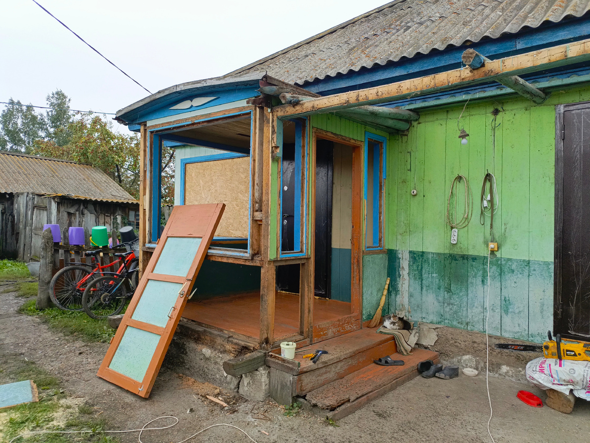 Выходной день жешь?! Ну с утра сам бог велел немного поспать, потом плотно поесть... В итоге мы вышли на разбор крыльцы в двенадцать. 😁 Рома махнул за цементом и насадками для перфоратора - площадку и фундамент, что под крыльцом, надо разбивать и убирать. Фундамент точно. Наш будет ниже. Да этот и сыпется весь. Из веселого - специально для сына (контент снимал для канала), да и мне на радость 🤭 сделали обрушение крыши. Не стали долго и нудно разбирать. Понравилось всем. 🤣 Потом, уже на земле разбирали. Сегодня все, что разобрали, распилить не получилось. Как уже говорила - дождь моросил и моросил... Ребенок немного попилил - разрядил два аккумулятора ручной пиле и ушел в дом. 😁 Перепилим потихоньку. 😉 Крыльцо полностью не стали убирать, оставили три доски, чтобы в пропасть не падать. 😁 Половину крыльца себе упёрла. Доски куда-то в дело использовать не будем - подгнили хорошо. А разбирать на дрова жалко. Такой настил хороший. 👇 Теперь на нем ванны с ведрами (с молоком) стоят