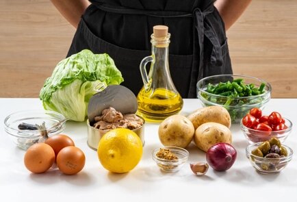 Современная интерпретация классического салата с печенью трески, который был неотъемлемой частью любого застолья в советские времена. Подготовить ингредиенты. Отварите картофель в кожуре, затем очистите и нарежьте крупными кусками. Отварите яйца вкрутую, охладите их под холодной водой, а затем нарежьте на дольки. Не размораживая, бросьте фасоль в кипящую подсоленную воду и варите 1 минуту. Затем переложите фасоль в холодную воду, чтобы она сохранила зелёный цвет и хрустящую текстуру. После этого обсушите фасоль на бумажных полотенцах. Салат промойте и обсушите. Очень большие листья порвите руками и поместите их в салатницу. Для заправки выдавите зубчик чеснока через пресс в чистую чашку. Добавьте горчицу, 2 столовые ложки масла из банки с печенью, лимонный сок, соль и перец. Хорошо перемешайте венчиком. Постепенно, взбивая смесь венчиком, добавляйте оливковое масло и продолжайте взбивать соус, пока он не превратится в эмульсию. Полейте листья салата приготовленной заправкой. Разрежьте