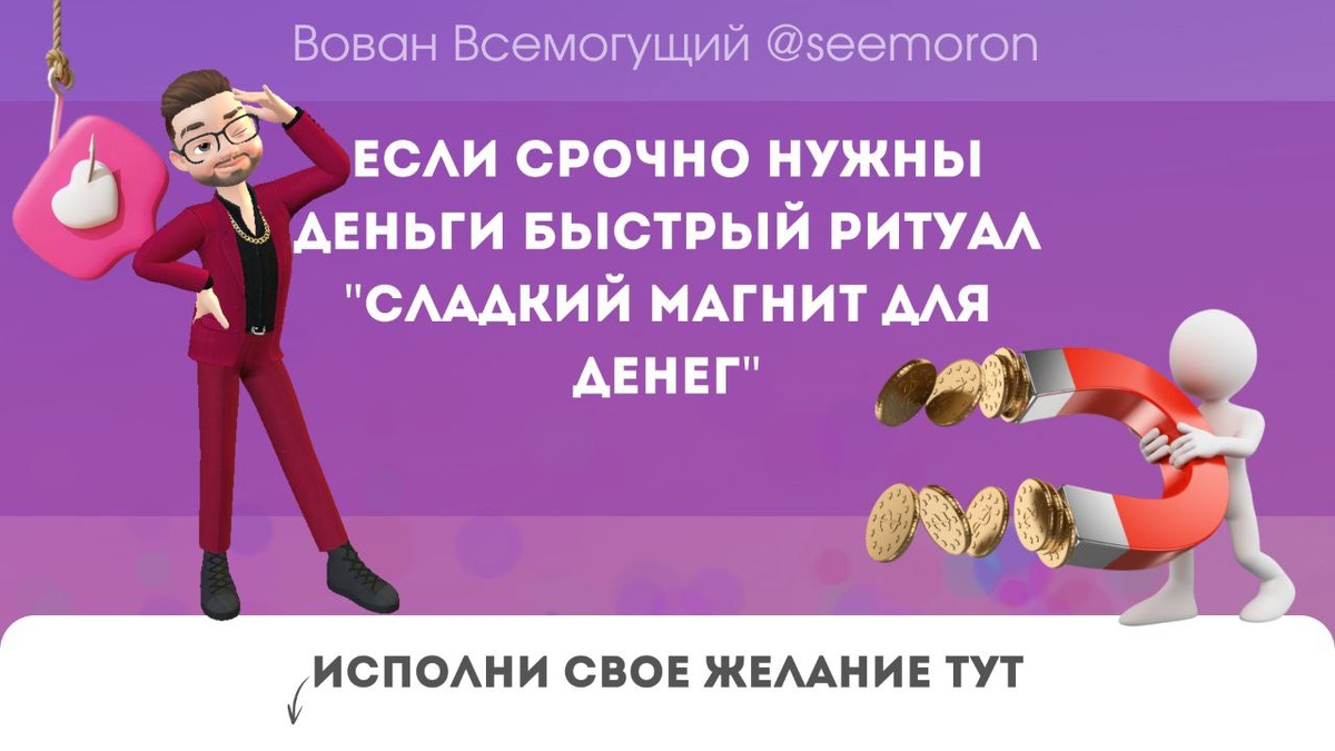 Ох, мои дорогие феюшки, волшебницы! Заметили, что денежки все мимо вас пролетают, будто мимо носа улетела сладкая булочка? Не беда, Вован Всемогущий знает, как привлечь к себе денежный поток, чтобы он бурлил, как речка после летнего дождя! Есть у меня для вас магический ритуал - "Сладкий магнит для денег". Это не просто игра, это практика на деньги с магией слов и обрядом! Для него вам понадобятся: 1. Окунитесь в магию! Смочите ручки водой, или, если вам хочется ритуала на привлечение денег посильнее, приготовьте теплую ванну 2. Создайте сладкую смесь! В одну ладошку насыпьте ложку сахара или меда, в другую корицу 3. Наполнитесь энергией изобилия! Разотрите ладошки друг о друга. Если вы решили принимать ванну, нанесите смесь на тело, от шеи до стоп 4. Произнесите слова благодарности: "Благодарю за то, что деньги приходят ко мне легко и свободно! Благодарю! Благодарю! Благодарю!" 5. Смойте волшебство! Ополосните ручки чистой водой (без мыла). Дайте им высохнуть естественным путем, хлоп