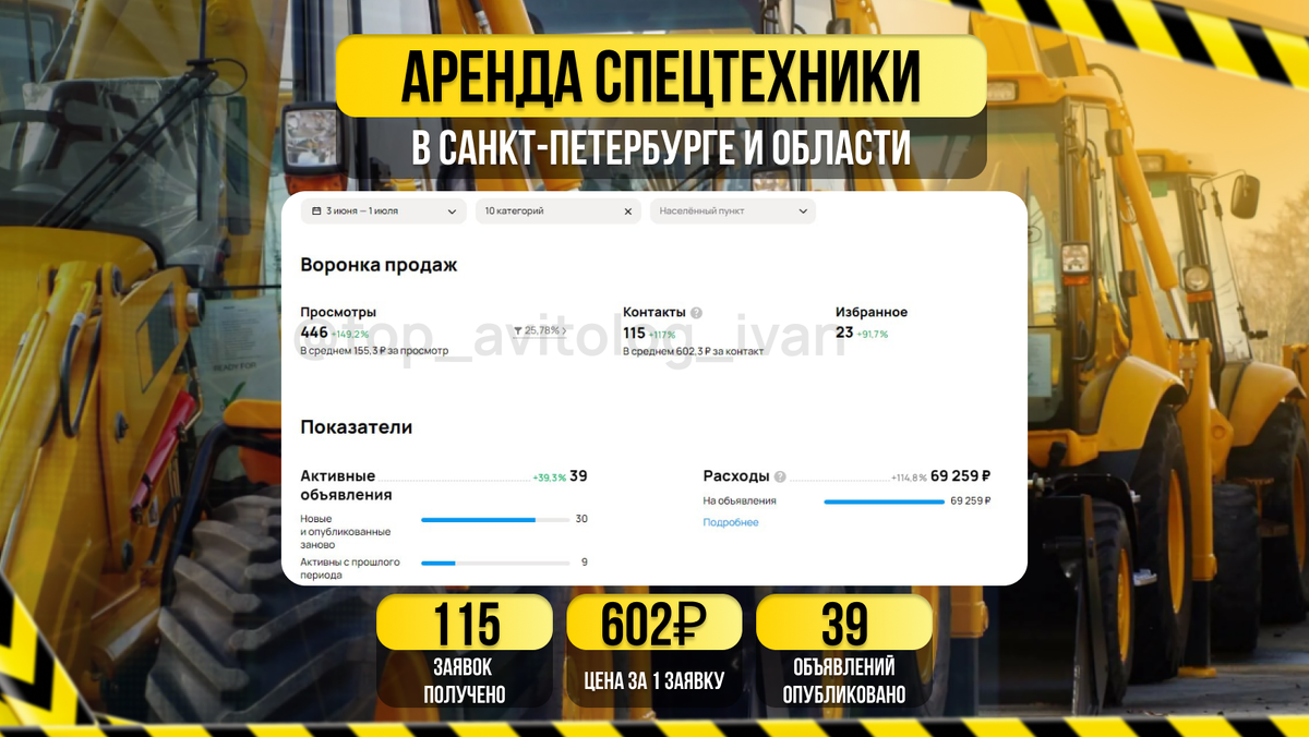🚜 115 заявок в месяц с Авито на аренду спецтехники. Цена за лид: 602 рублей. Эффективное продвижение на Avito.