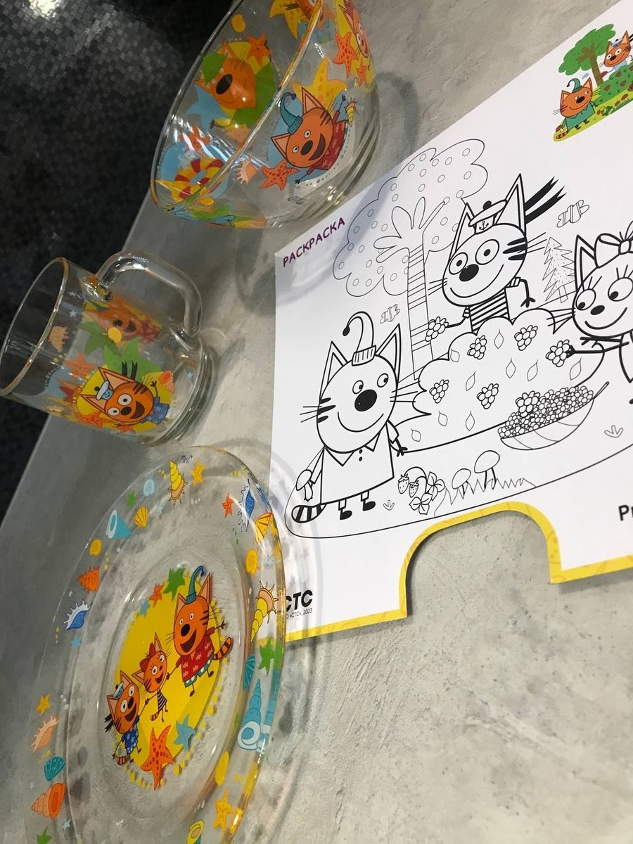 Начнём мы со стеклянного набора посуды,состоящего из тарелки, салатника и кружки. Нам подарили этот набор, пока он лежит в кладовке, ждёт своего часа. Пока боюсь давать, дочка может разбить посуду, у нас иногда такое случается. Хотя из кружки мы умеем пить, плюс любимые герои мультфильма... Раньше такой набор продавали в Победе, сейчас уже, наверное, его не найти там.