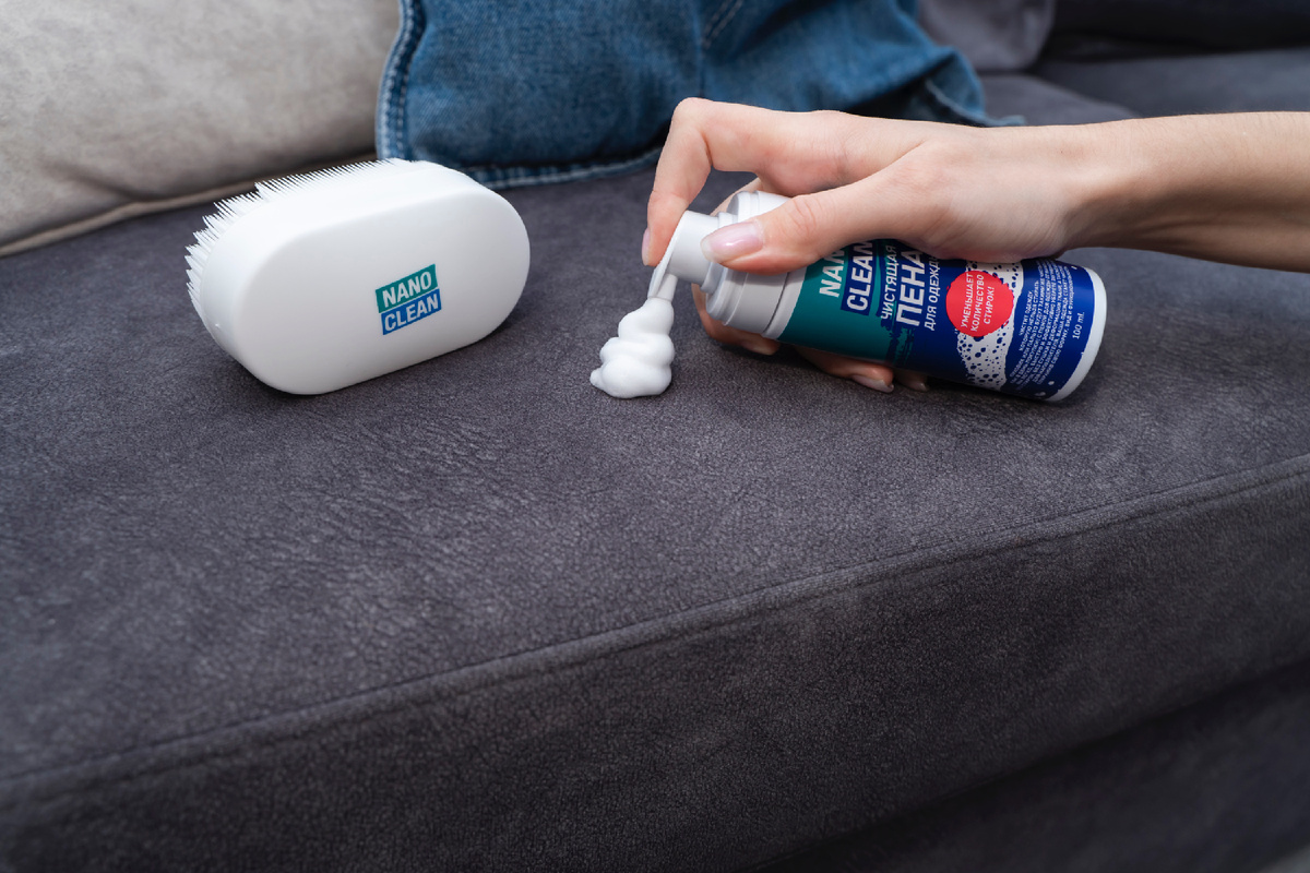 Если на светлую обивку дивана попали капли вина, а в химчистку обращаться не хочется (а иногда и невозможно), на помощь могут прийти специализированные средства, которые быстро и безопасно для материалов очистят их от любых загрязнений. Для быстрого решения любых неприятностей можно воспользоваться очищающими продуктами, которые разработаны специально для таких случаев. Они подействуют точечно — почти как парогенератор, но без лишних затрат. Это скорая химчистка для вещей в домашних условиях. Пена не деформирует ткань, не вредит наполнителю и не требует сушки. Всего за пару секунд она выведет на поверхность любое загрязнение, полностью очищая изделие. Идеально для дивана из экокожи или кожи. Легко наносится и действует на загрязнение, растворяя его. Средство не требует разбавления водой и подходит для всех типов материалов и поверхностей. Такие продукты достаточно стереть с поверхности салфеткой из микрофибры или щёткой, подобранной в соответствии со сложностью загрязнения и типом ма