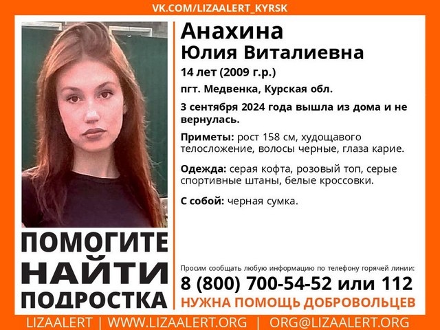 Поисковый отряд «Лиза Алерт Курск» распространил ориентировку на поиски без вести пропавшей 14-летней жительницы поселка Медвенка. По данным волонтеров, 3 сентября девушка-подросток вышла из дома и не вернулась. Местонахождение неизвестно. Требуется помощь добровольцев в поисках. Вечером 8 сентября пришла хорошая новость. Юная курянка найдена, она жива. Сергей Яшин, по материалам https://vk.com/lizaalert_kyrsk Постоянный адрес новости на сайте «Друг для друга» ~ https://dddkursk.ru/lenta/2024/09/08/111868/. Новости Курска за ~ 8 сентября ~ сентябрь 2024 года.