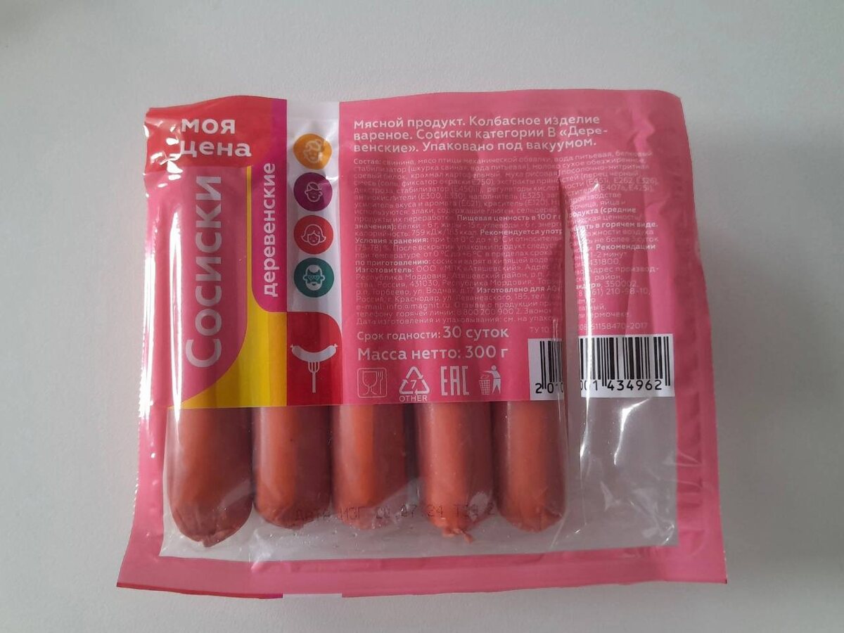За сосиски «Деревенские „Моя цена“» заплатили 24 рубля. В трехсотграммовой упаковке их было шесть штук. После разогревания «колбаски» стали кровавого оттенка. По консистенции были больше похожи на «неприятный» паштет.