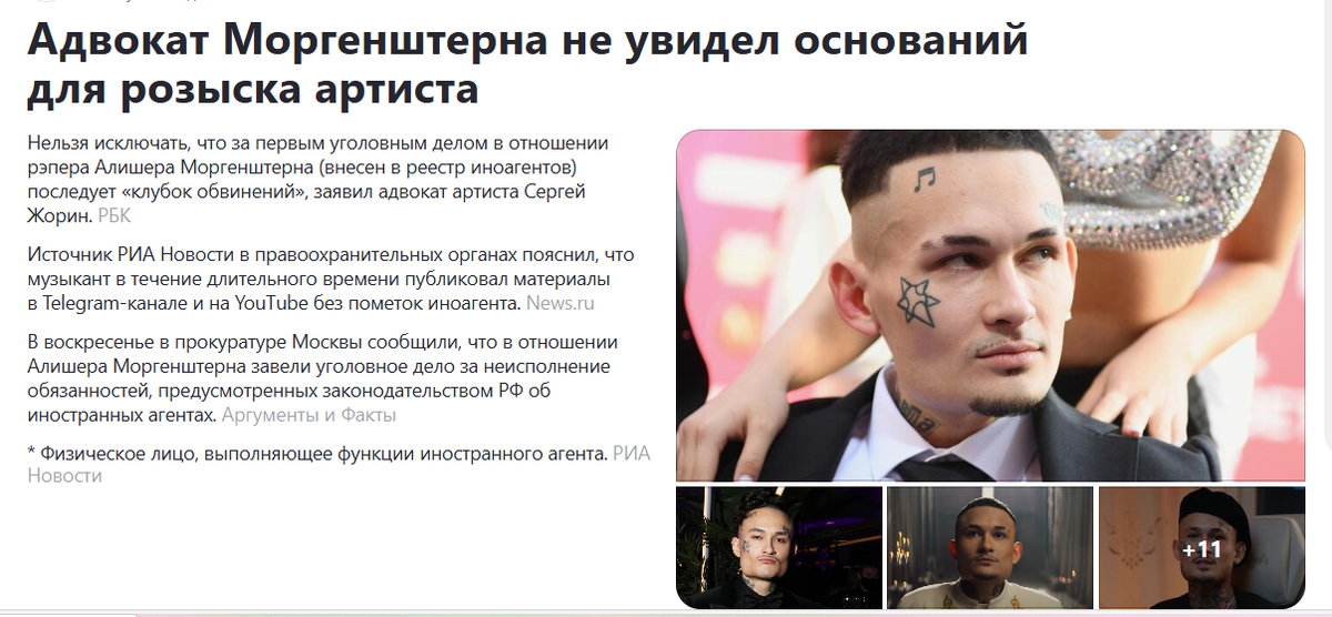 "Ранее в прокуратуре сообщили, что Моргенштерна могут объявить в розыск. Рэпера подозревают в уклонении от исполнения обязанностей, предусмотренных законом об иностранных агентах. Он делился в соцсетях материалами без указания на то, что они распространяются иноагентом," - сообщает интернет-издание Lenta.ru
