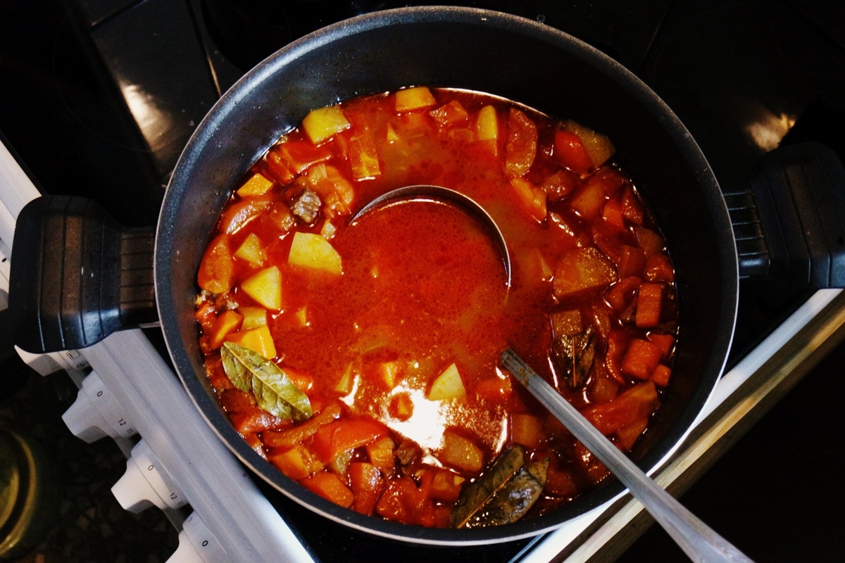 Холода - время варить гуляш!.. Настоящий, венгерский, с паприкой: Говяжья лопатка -800 г Молотый черный перец - по вкусу; паприка - 2 ст.ложки Помидоры - 300 г Перец болгарский - одна штука Красное сухое вино - 80 г Чеснок - 2 зубчика Тмин - ½ чайные ложки (Э. Мадьяр предупреждает, что тмин кладется только в венский вариант гуляша) Жир -1 столовая ложка Соль - по вкусу Вода - 3 стакана Но я, когда одна жила, то готовила вот так: Только томатную пасту не добавляла. Помидоров с перцем и паприкой мне вполне достаточно было. Отец, помню, приехал из Венгрии и кинулся готовить гуляш. Вкусный и обжигающий. Он был в Будапеште в марте, когда стоял страшный холод - им одним и согревался. Ну и походами в ванны, конечно... — Его там на улицах должны продавать в котлах и разливать в стаканы, - говорю. - Судя по тому, что там бывает мерзко, серо и холодно (но я нашла один солнечный день и выудила оттуда фотографии!), - всюду эти подсохшие корочки грязного льда и снега. Подозреваю, что для меня зима