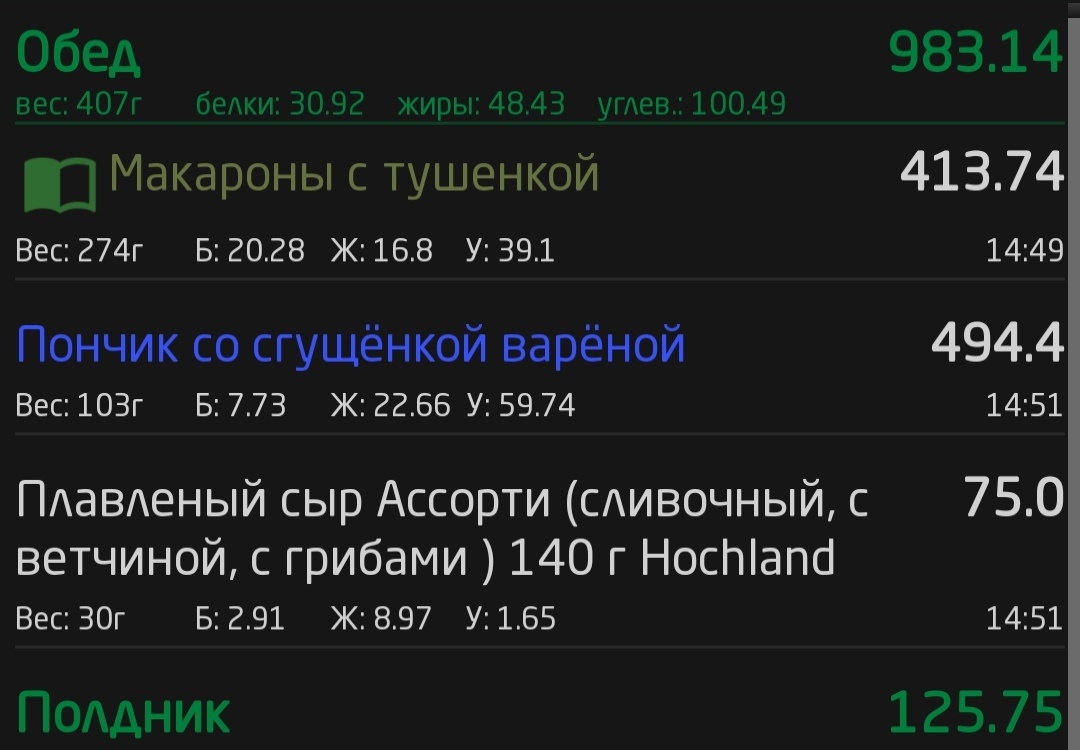 Здравствуйте! Подолжила похудение. Худела с 73,5 кг хочу вес в 50 кг. Рост 151см, возраст 46 лет, вес на данный момент 64 кг. Не завтракала, некогда было. Обед: Пончиком угостили. Был вкусный) Полдник и ужин : Захотелось доширак. Заварила. В итоге не съела и половины. Расхотелось) Итого за день: Худею дальше) *** Обязательно! читаем ПРАВИЛА КАНАЛА прежде чем писать комментарий! В статье с правилами есть ссылки на подборки других публикаций. *** 📌 Если вам это интересно, то можно подписаться на канал нажав СЮДА что бы ничего не пропустить *** Здоровья, добра и счастья Вам! Давайте будем взаимовежливы! 🫶