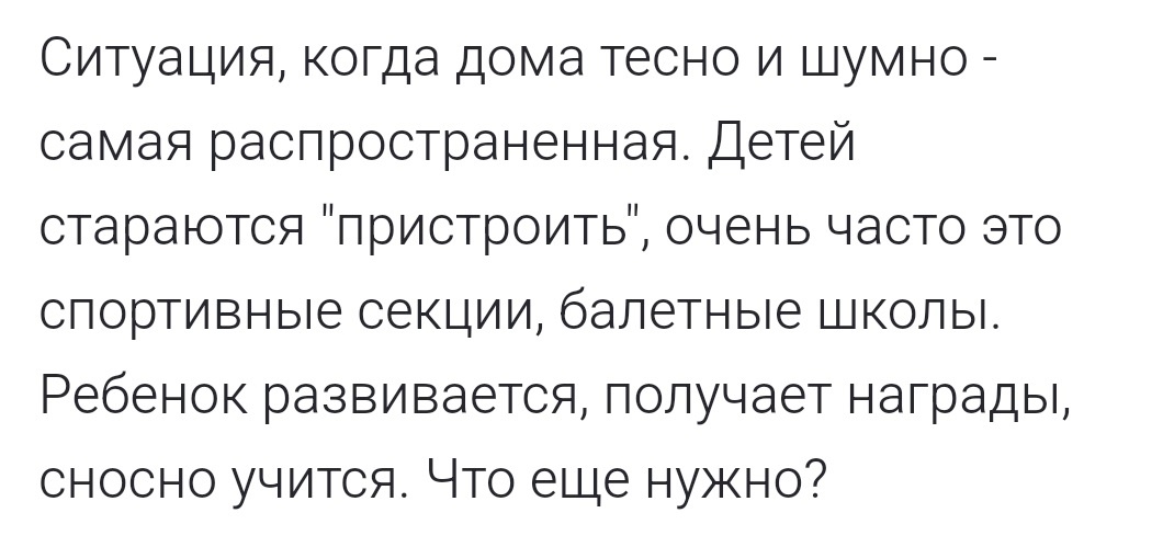 Итак, автор считает, что детей "пристраивают" в спорт, музыку, балет только для того, чтобы "дома не было шумно". При этом статья иллюстрируется фотографией одетых в рванье людей на фоне ободранных стен и кучи каких-то тюков, видимо, иллюстрируя уровень жизни многодетных семей. Ну да, мы же все живем именно так, я же совсем забыла (это сарказм). А еще - родителям "нет дела до детей", они (родители) либо много работают, либо спиваются.