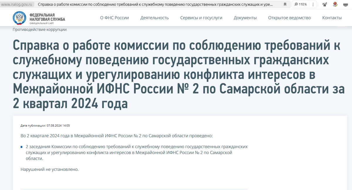 В апреле 2024 года Прокуратура Самарской области внесла руководству МИ ФНС №2 представление с требованием устранить нарушение законодательства о противодействие коррупции, усмотрев наличие конфликта интересов. Фискальный орган провел внутреннюю проверку, организовал заседание комиссии по соблюдению требований к служебному поведению госслужащих… И не увидел каких-либо выгод для проверяющего инспектора в трудоустройстве близкого родственника к проверяемому налогоплательщику в период проверки.