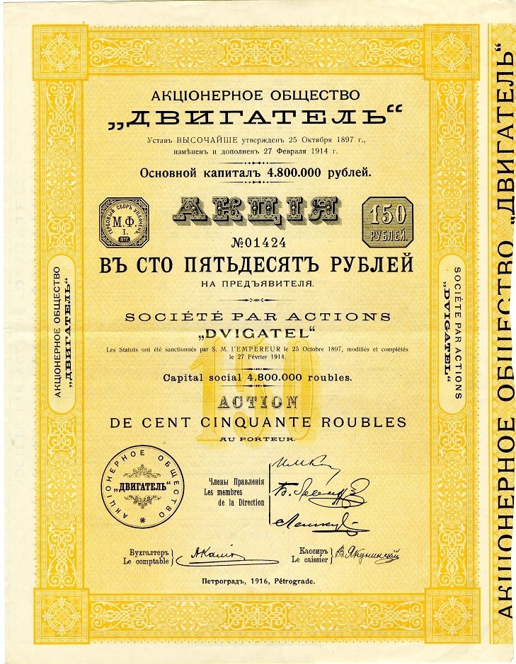 Ценные бумаги. Взгляд в прошлое. Акционерное общество «Двигатель».