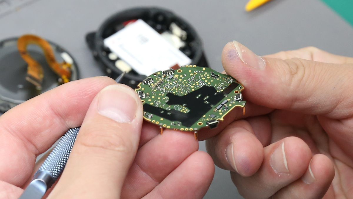Garmin Fenix 6 – это одни из самых часто встречаемых смарт-часов в нашем сервисе Remphone. В ремонте Garmin Fenix 6X Sapphire встречается одно слабое звено конструкции – Flesh-память. Очередного нашего клиента постигла таже участь – в часах вышла из строя Flesh-память. Проблема, а точнее симптомы были следующие: гаджет периодически зависает и перестаёт реагировать на нажатие кнопок. Наш инженер включил часы, чтобы проверить функции. Да, кнопки, действительно, перестали реагировать. Возможно, проблема только в кнопках, но после того, как часы зависли у специалиста отпали всякие сомнения. Берёмся за детальную проверку всех узлов девайса. Первым делом наш инженер снимает дисплей, отвинтив крепёжные элементы часов. Далее необходимо отсоединить шлейф дисплея от платы, аккумулятора, пульсометра и вибромотора. Отвинчиваем плату и кладём её на «операционный» стол. Первым делом попробуем «шевельнуть» микросхему памяти, то есть точечно нагреть нужный нам элемент, для возобновления контакта с пла