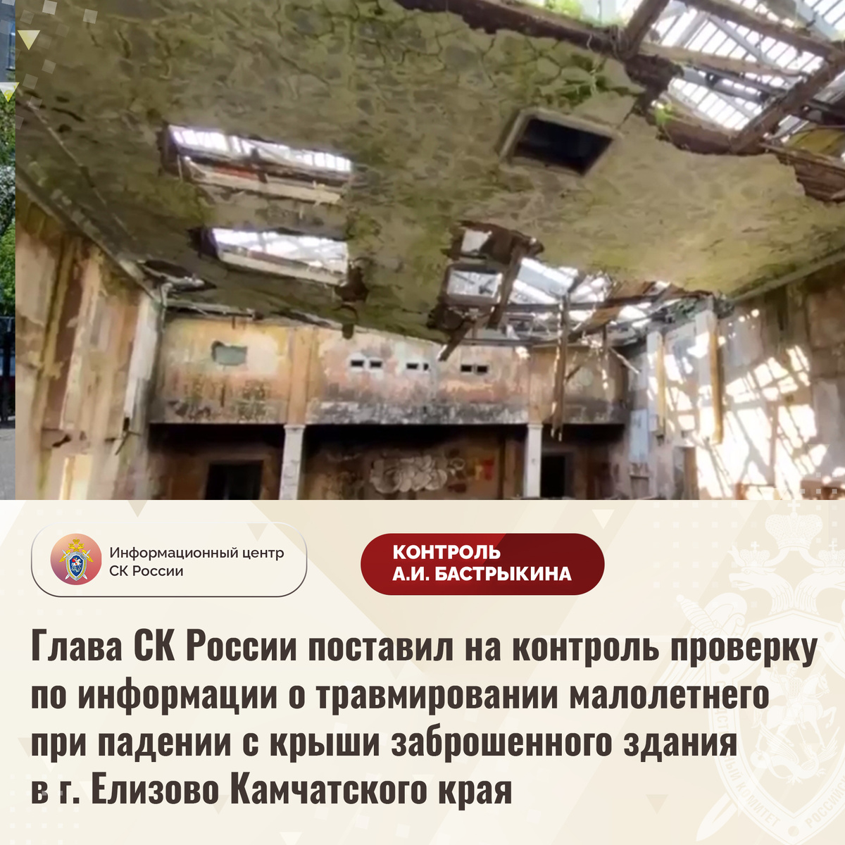 Глава СК России поставил на контроль проверку по информации о травмировании малолетнего при падении с крыши заброшенного здания в г. Елизово Камчатского края