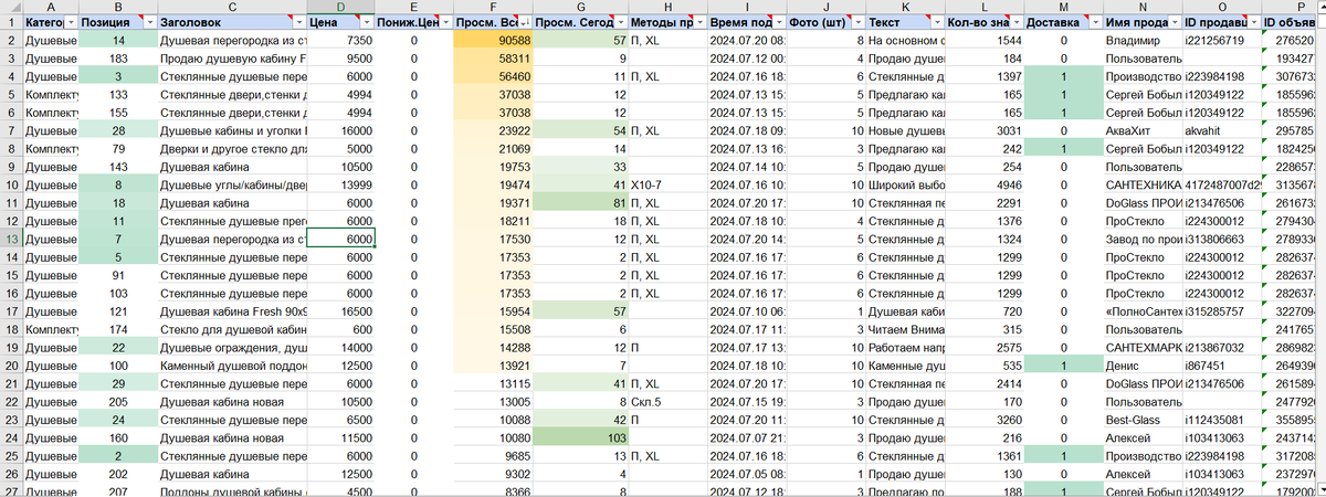 Название объявления, описание товара, цены, позицию, количество фото, знаков в объявлении, количество просмотров всего и за сегодняшний день, методы продвижения, дата и время поднятия, наличие доставки, данные продавца - все, что есть на Авито, Superseller.pro найдет и аккуратно разложит по полочкам.