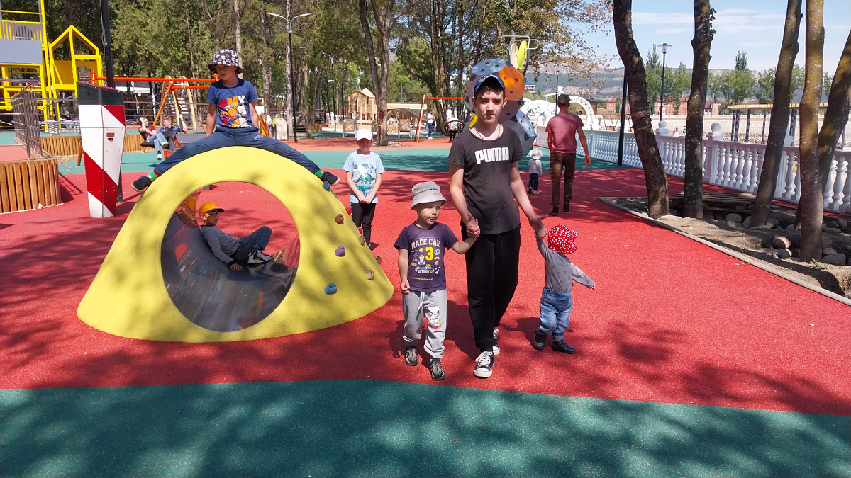 Погода наладилась, весь день светило солнышко, ветер значительно ослабел. Девчонки сегодня угулялись, ездили на старое озеро в Кисловодске. Площадка большая, локаций много. Народ есть даже в понедельник утром. Пока родители купаются и загорают на лежаках, детям есть, чем заняться. Мы обошлись без купаний, гуляли вместе с детьми. Для тех, кто на канале впервые: в нашей семье 8 детей. Троих родила сама, 5 забрали из казённых стен. Старший сын живёт отдельно. Поехали на такси, без колясок, чтобы девочки погуляли ножками. Перекусили там же, чтобы приехать домой под самый сончас. После 3х часового беганья малыши проспали 4,5 часа в обед без задних ног. Все пятеро (Оля спит вместе с ними, редко выдерживает день на ногах). Удивили качели для детей в инвалидных колясках. Я такие ни в одном городе не видела, хорошо, что обо всех детях создатели площадки подумали. Девочки "застряли" в огромной песочнице, пересыпали и игрались в песке целый час. Увидели других детей. Маша гладила маленького
