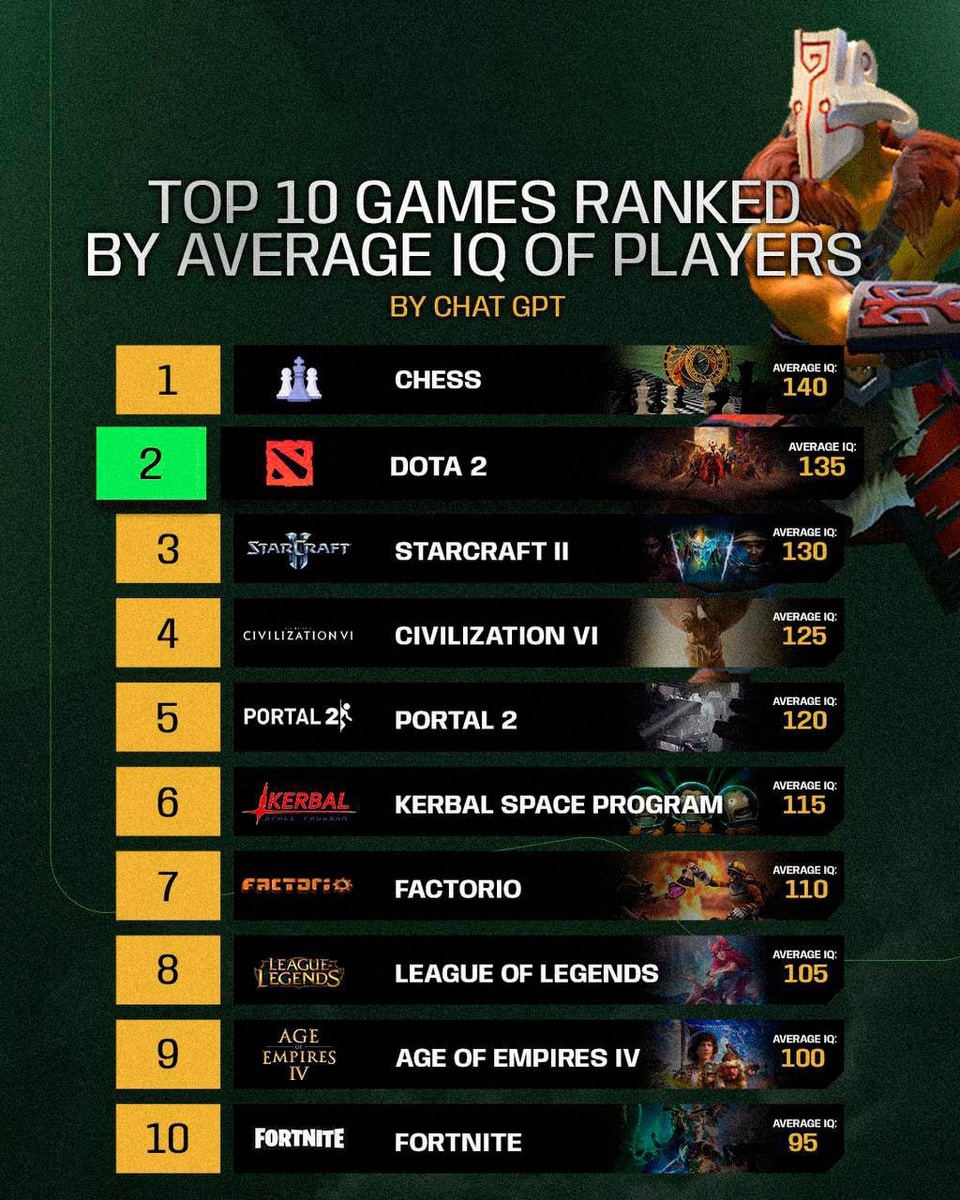 тгкhttps://t.me/fortniterrsСhatGPT составил список «самых умных геймеров», поставив дотеров на второе место – сразу же после шахматистов.Вот тут верю, вот тут плюс