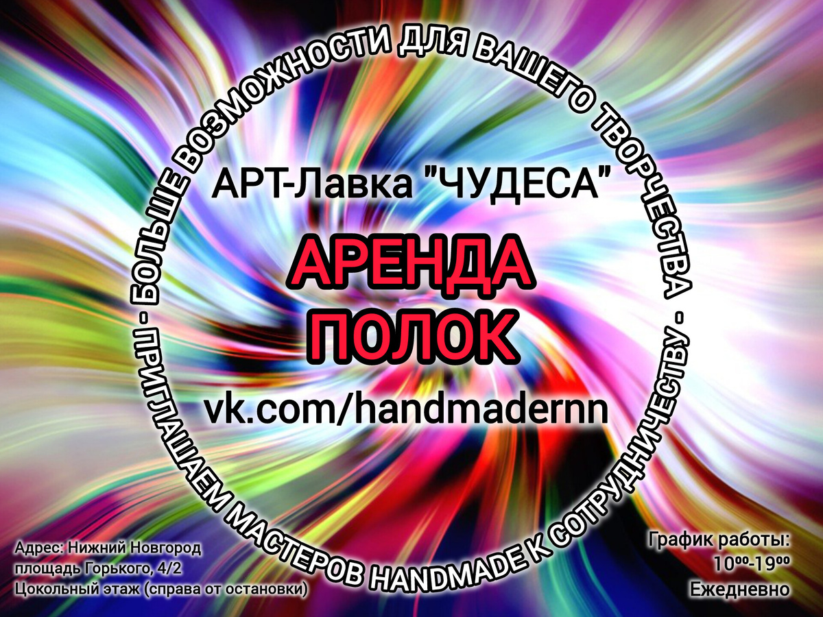 В Нижнем Новгороде открылся новый магазин с возможностью арендовать полку по изделия ручной работы. Подробности в группе ВКонтакте vk.com/handmadernn АРТ-Лавка "ЧУДЕСА" Адрес: площадь Горького, 4/2 цокольный этаж со справа от Аптеки ВИТА по улице Маслякова.