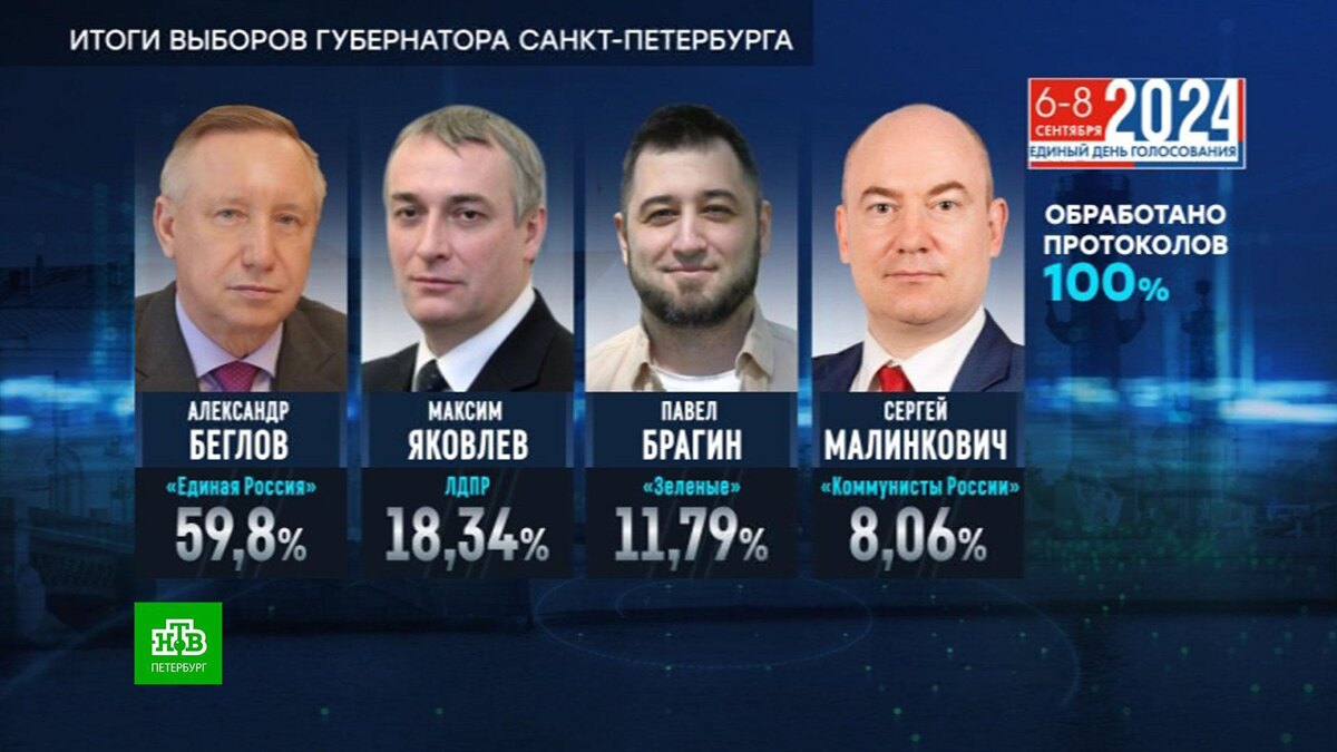 [ Смотреть видео на сайте НТВ ] Выборы в Петербурге признаны состоявшимися. Горизбирком обработал все 100% протоколов. Впервые голосование на выборах главного должностного лица Северной столицы длилось три дня. Также Петербург голосовал за муниципальных депутатов и довыбирал депутата Заксобрания по округу №18. На выборах губернатора победу одержал действующий градоначальник Александр Беглов. Он набрал 59,8% голосов избирателей. В абсолютном значении это 895 тыс. 307 проголосовавших. Второе место занимает кандидат от ЛДПР Максим Яковлев (18,34%), на третьем — Павел Брагин от партии «Зеленые» (11,79%). Замыкает список представитель «Коммунистов России» Сергей Малинкович, получивший 8,06%. Отметим, что результат Александра Беглова (59,8% голосов избирателей) — самый низкий среди всех руководителей субъектов, одержавших победу в регионах. И этот показатель почти на 5% хуже, чем по результатам прошлого волеизъявления. В 2019 году за Беглова проголосовало 64,4%. Как отметил председатель горо