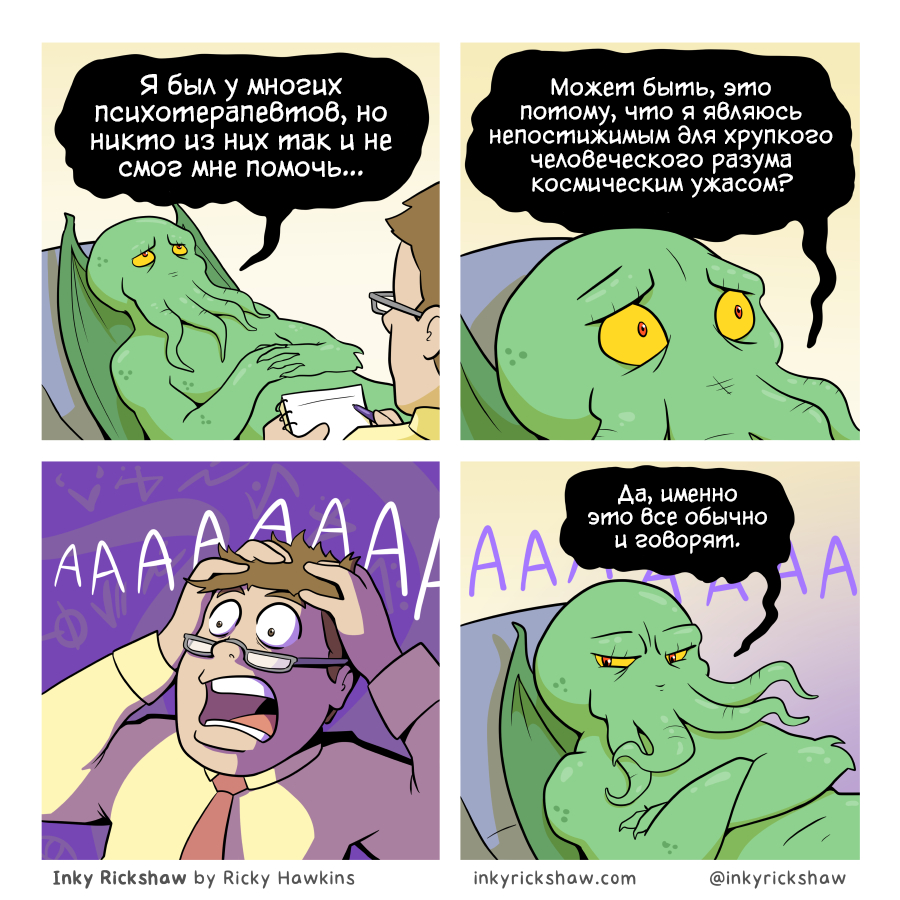 Сложно отрицать, что любое художественное произведение в той или иной мере отражает личность автора. Это работает даже в том случае, если речь идет даже о таком коротком формате, как юмористические веб-комиксы: авторы могут рисовать сюжеты о самих себе или просто вдохновляться собственными хобби и увлечениями. К примеру, герой сегодняшней статья явно тяготеет к настольным ролевым играм и мифическим и сказочным историям, что отлично видно по его работам, в которых читатели могут встретить персонажей вроде Ктулху или Красной Шапочки. Надеюсь, что эти комиксы вам понравятся! Inky Rickshaw (англ. «Чернильная рикша») - это серия юмористических веб-комиксов, созданная британским художником Рики Хокинсом (Ricky Hawkins). Проект стартовал в 2018 году, новые выпуски по сей день выходят каждую неделю - за их появлением можно следить в соцсетях (легко найти по нику inkyrickshaw), а также на официальном сайте серии. Как признается художник, в заголовке Inky Rickshaw нет какого-то особого смысла: